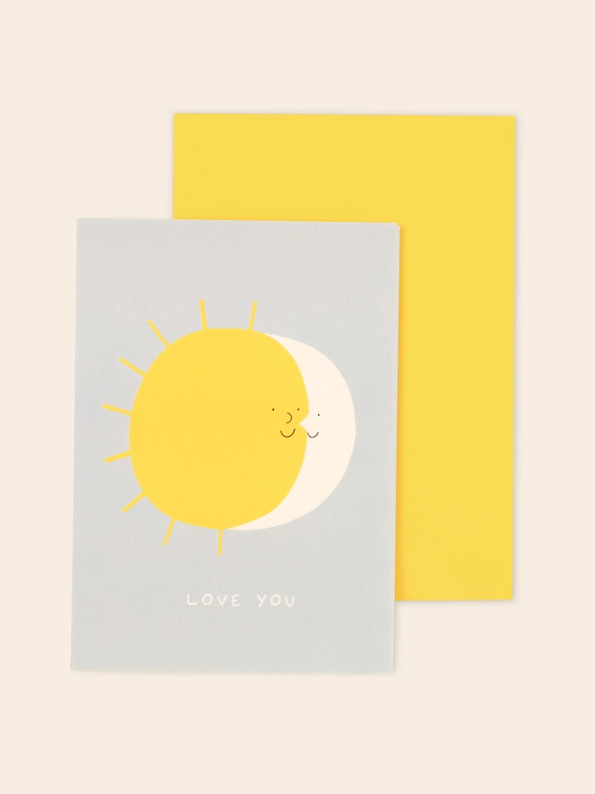 Cute illustrated sun and moon looking at each other lovingly. Perfect for Valentine's Day or an Anniversary. Text reads 'Love You'
