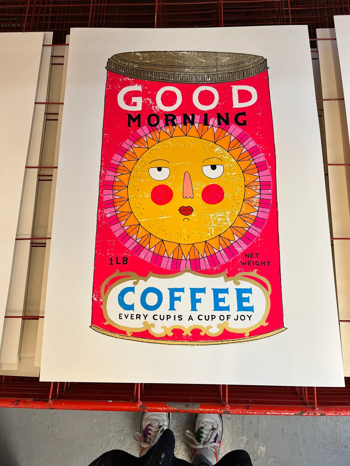 A bright and cheery hand made screen print of a coffee tin, featuring a glowing sun - guaranteed to wake you up in the morning and keep you smiling all day.
