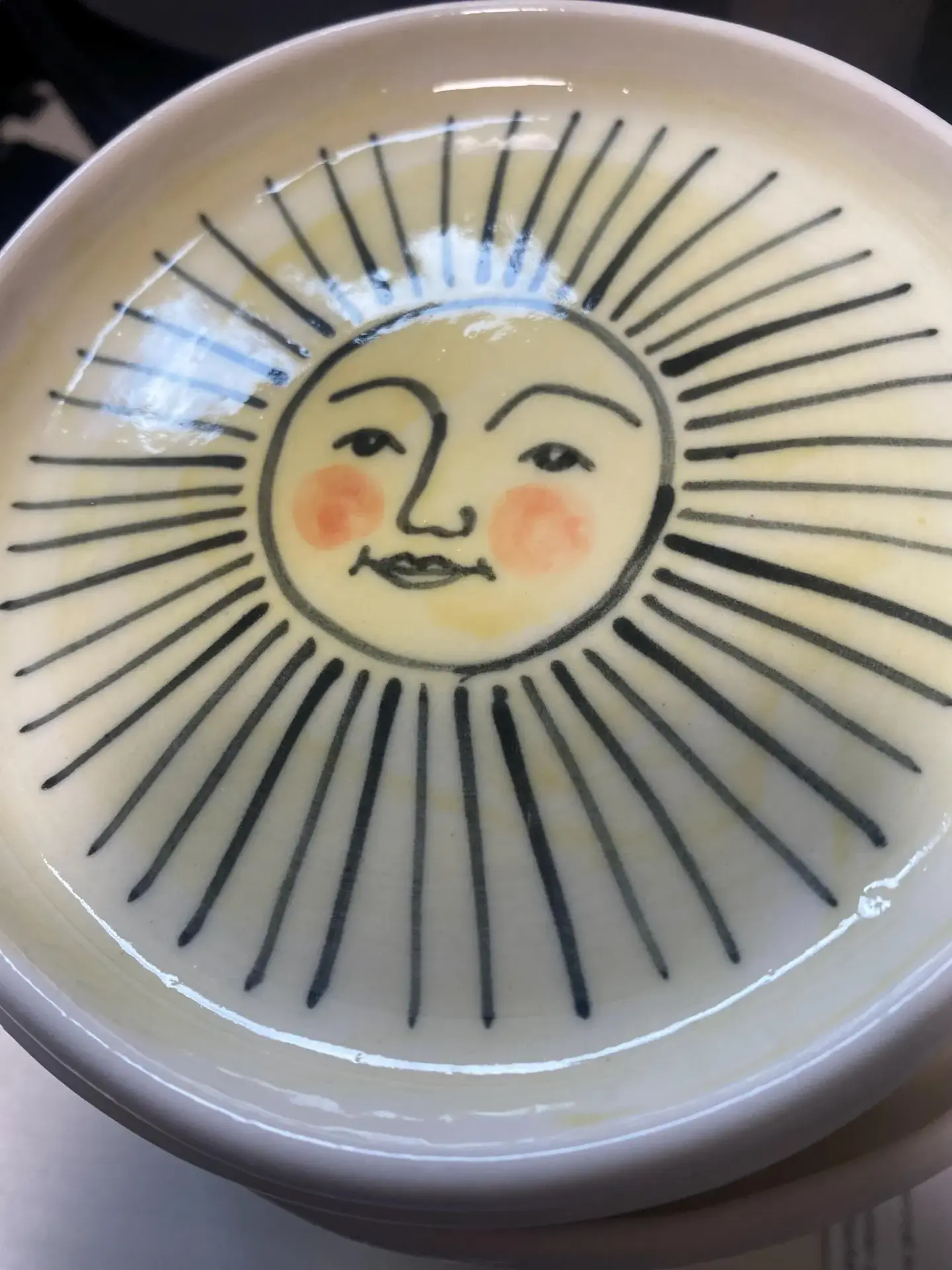 Ceramic white stoneware clay Sun trinket dish. Hand painted with slip and underglaze whilst the clay is leather hard and then bisque fired once dry...