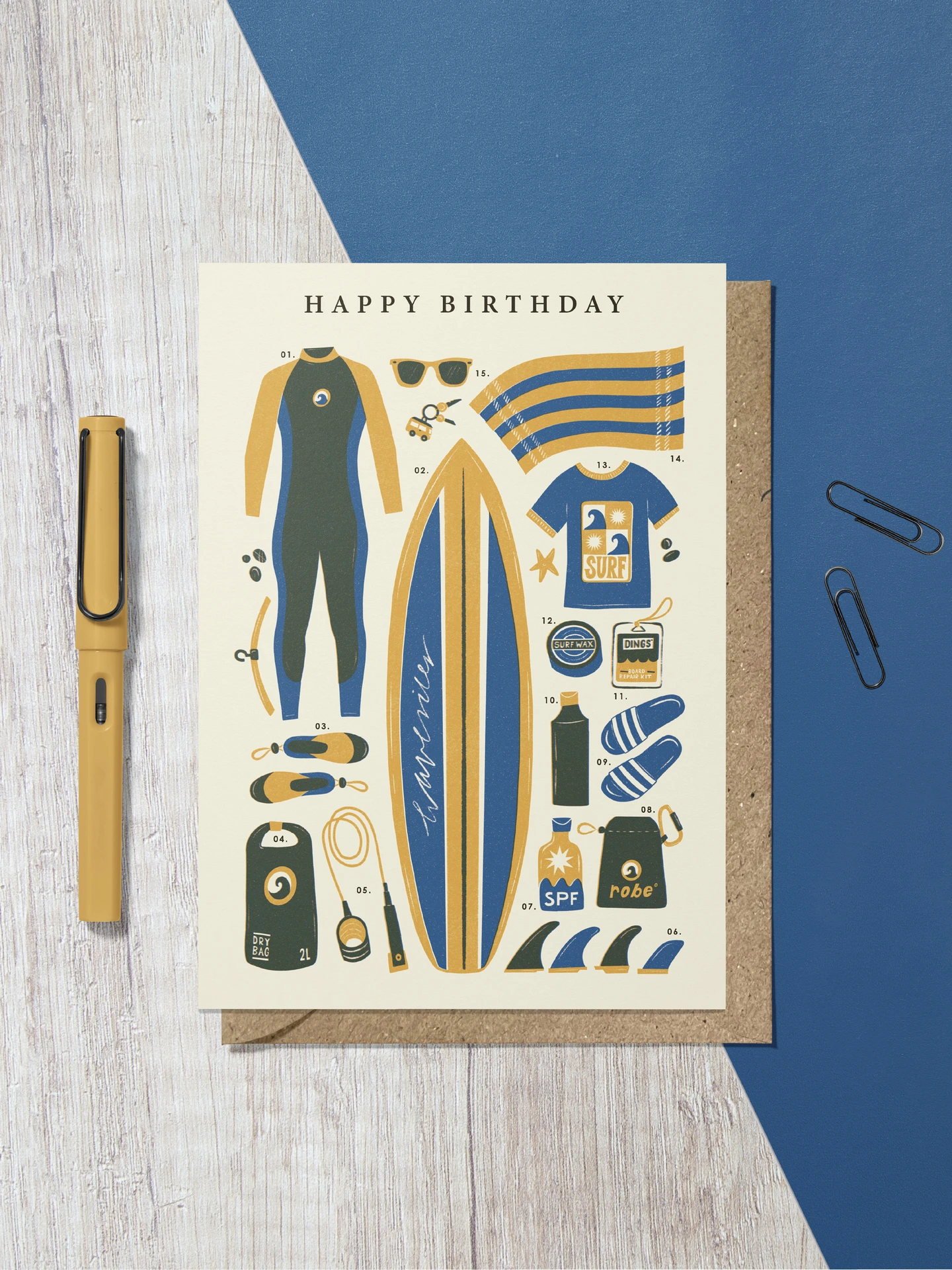 A colourful risograph-style Birthday card series capturing all the essentials for popular outdoor activities and sports. Each card also has a little annotated kit list on the back...