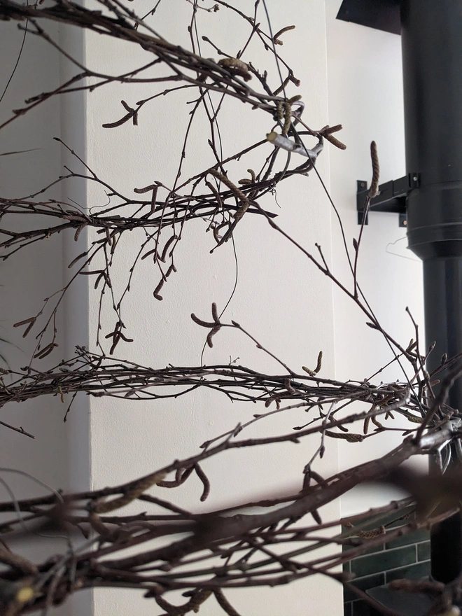Create a light, natural statement in your home with this hand-tied suspended wreath made from delicate birch branches. Designed on a sturdy wire frame and finished with four ties for balanced hanging, this elegant piece brings organic texture and Scandinavian-inspired simplicity to any space.