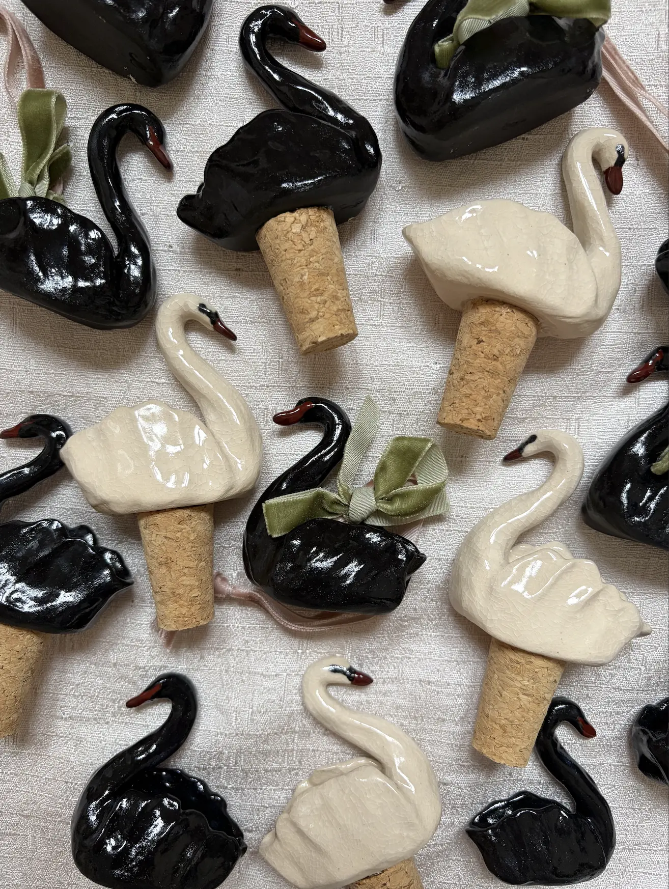 One hand sculpted decorative swan bottle stopper with a natural cork, in white crackle glaze or black.