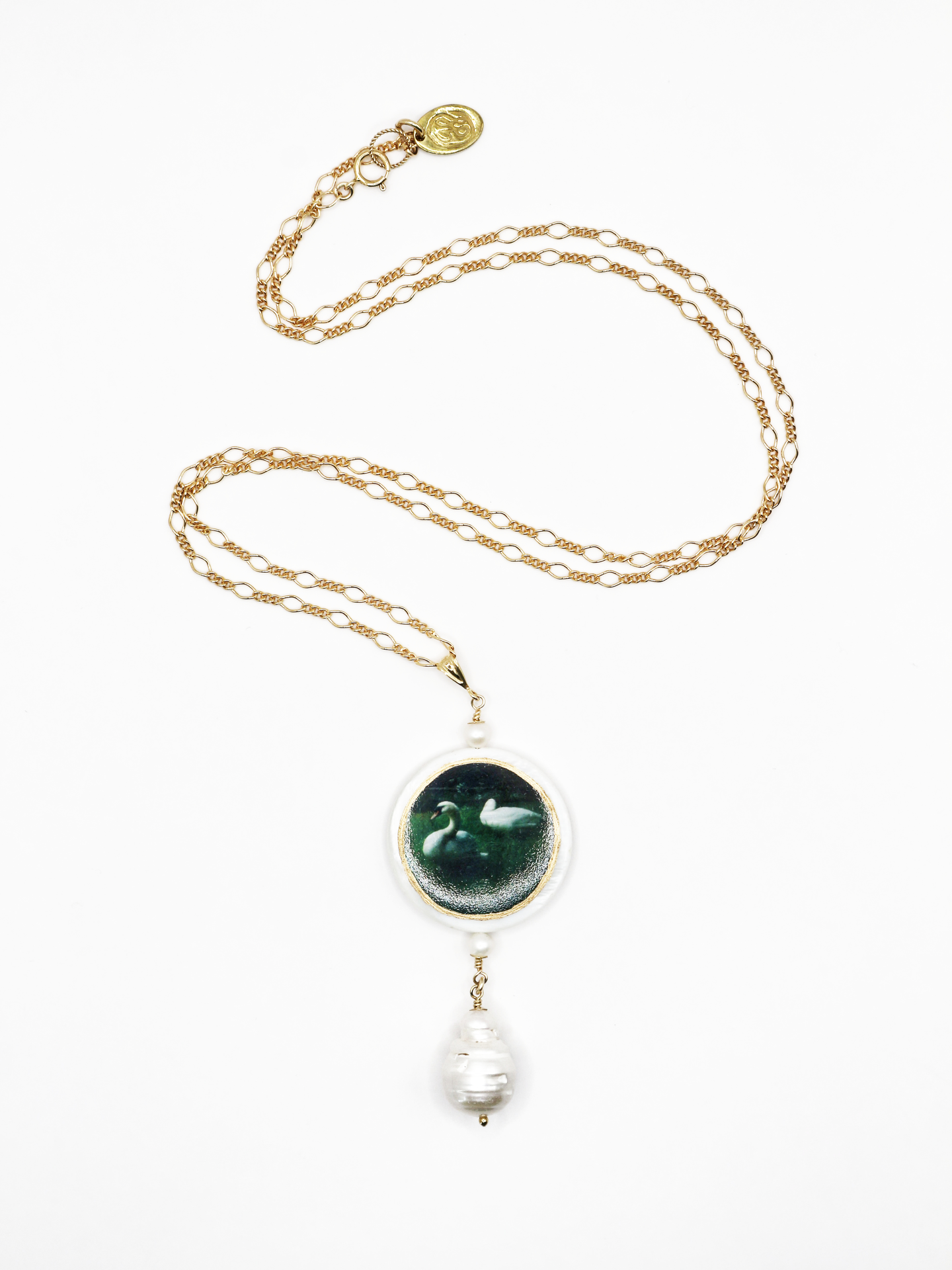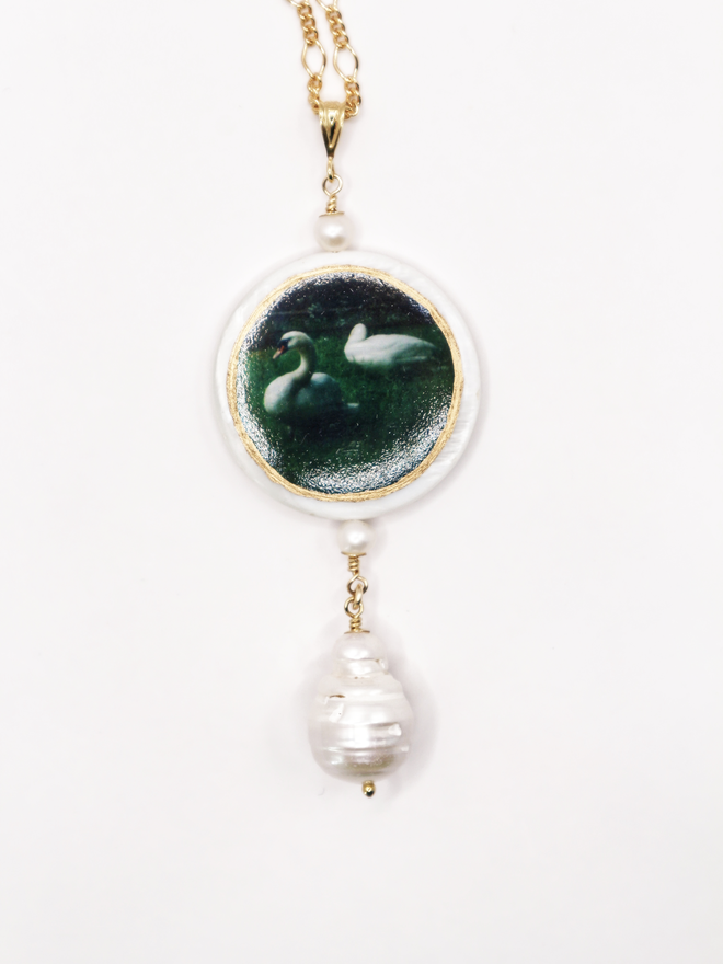 A large circular mother of pearl pendant hand printed with the image of swans in a garden, from my personal photographic archives. This pendant is boldly finished with a large teardrop pearl and accompanying small potato pearls, all set in 14ct rolled gold on a 14ct rolled gold chain.