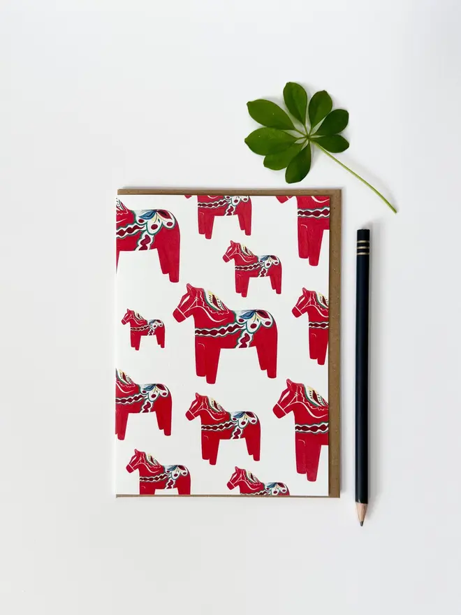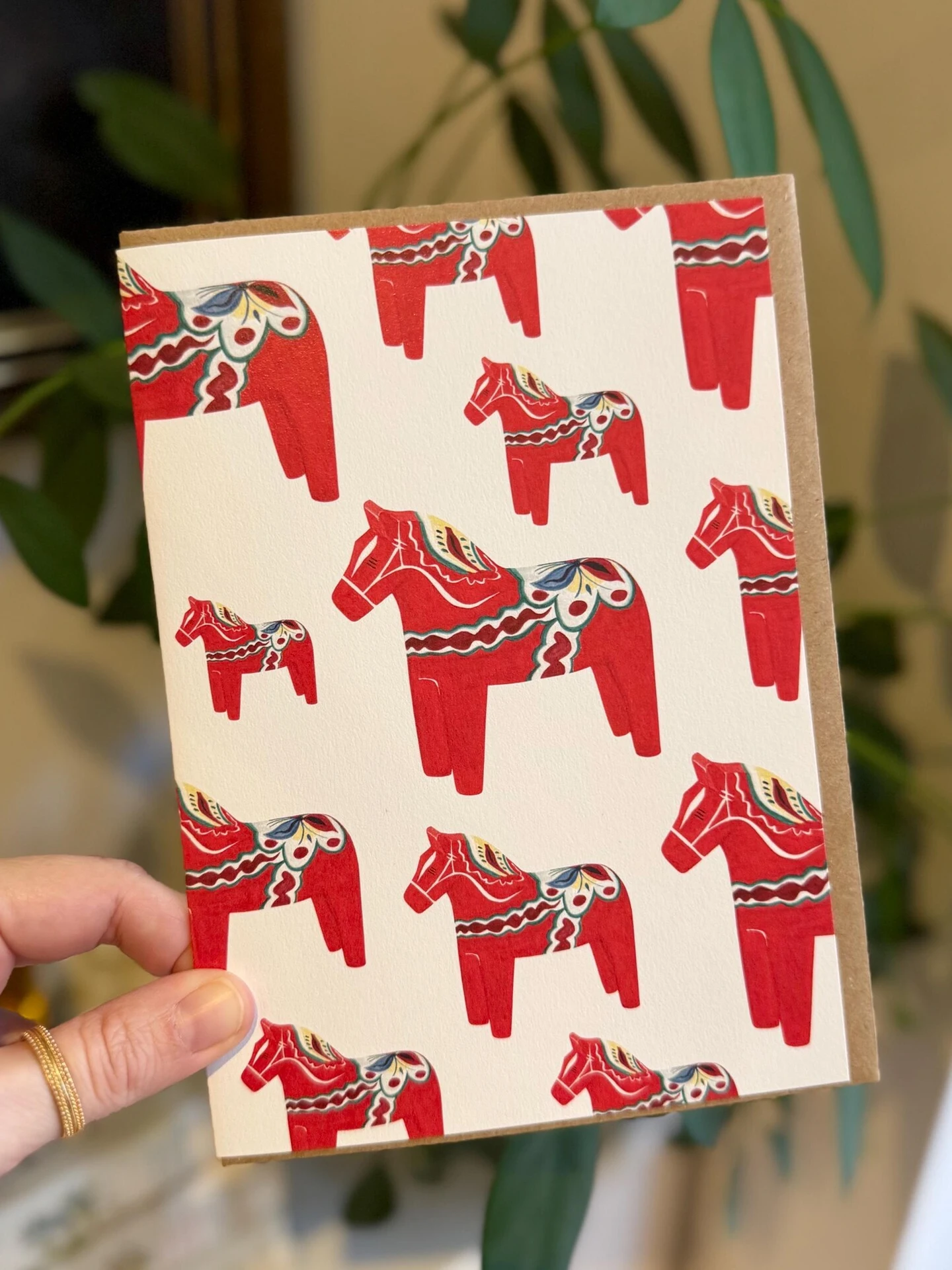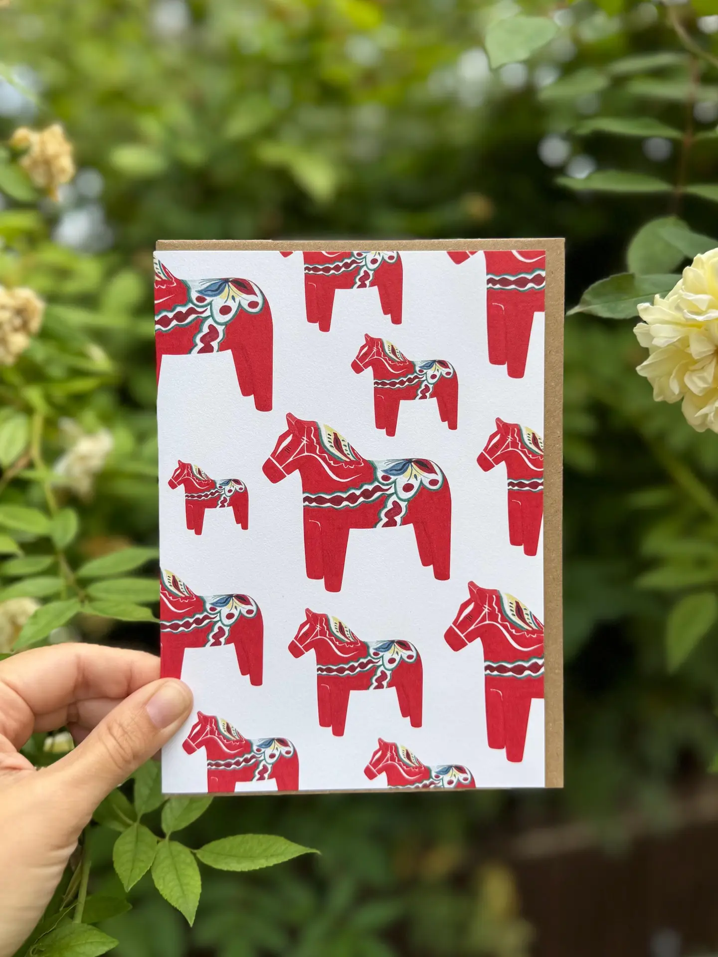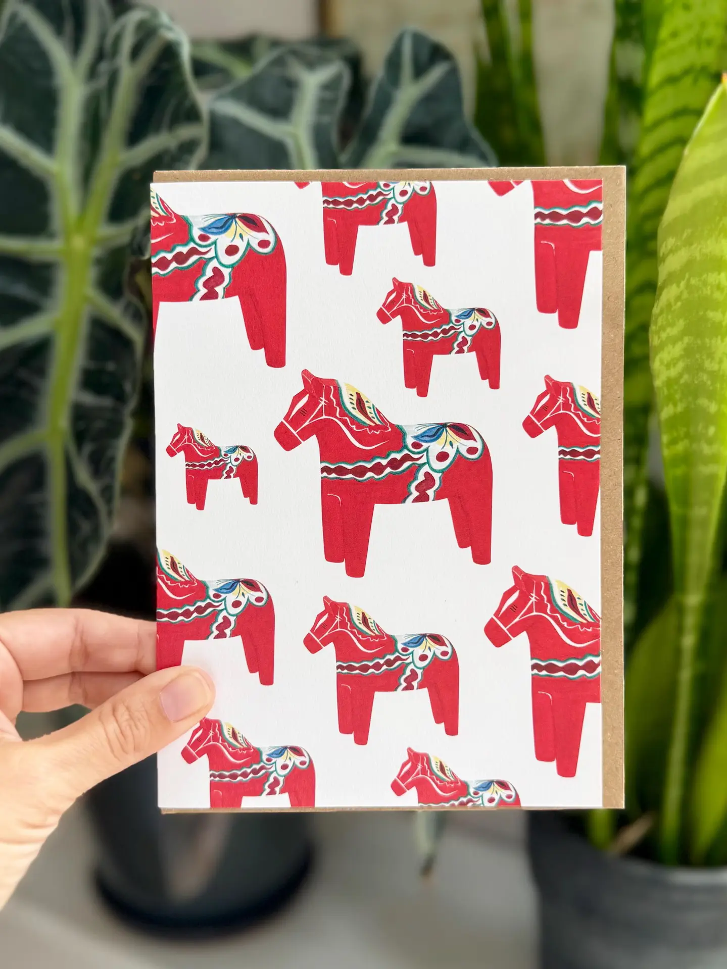 The Swedish Dala Horse is a symbol of strength, luck and prosperity. It is traditionally carved in wood and painted in this typical folk art kurbits style and pattern. This card is perfect for any celebration, well wish or perhaps as a birthday card for t...