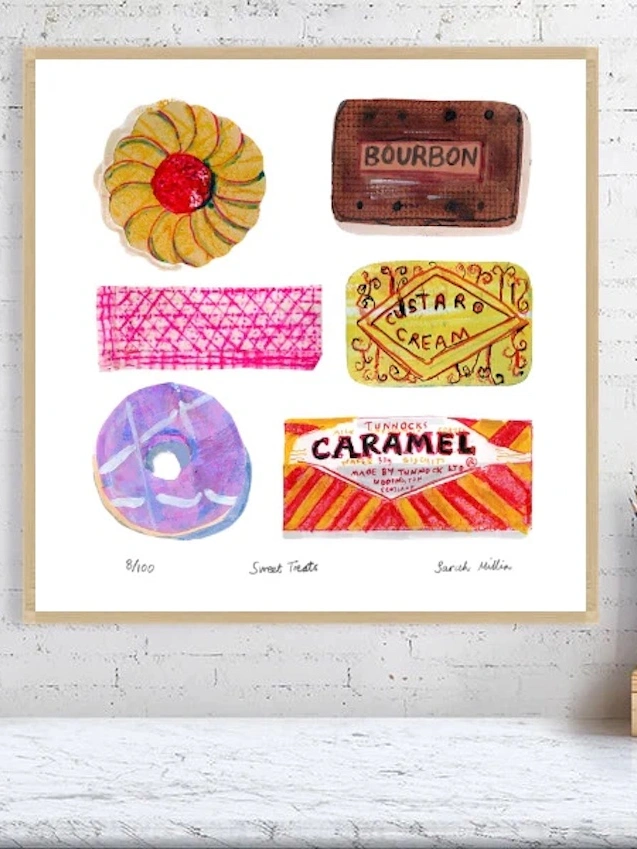 Which would you choose to savour with your cuppa? A print featuring biscuit tin favourites. A custom product produced from hand created mixed-media artwork...