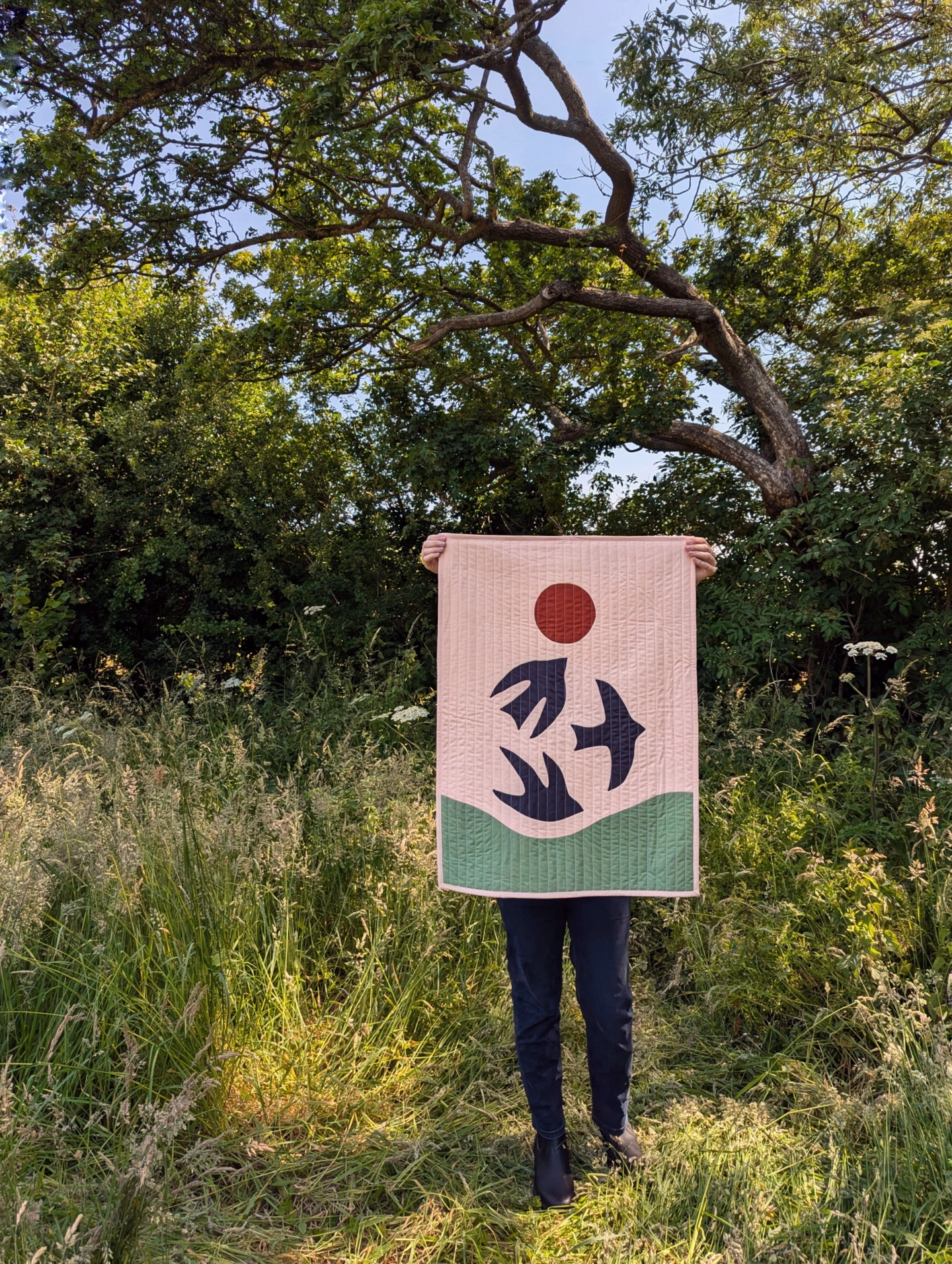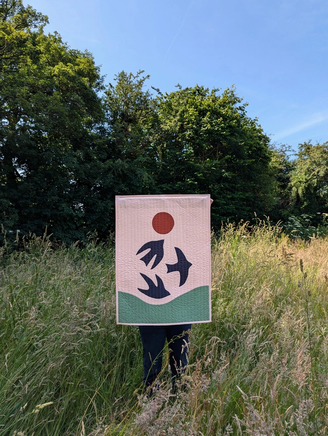 Inspired by the English countryside and traditional folk art, this textile artwork combines piecing and hand appliqué techniques to create a striking and tactile addition to any wall. Featuring folk birds against a colourful abstract landscape, this made-to-order piece includes a hanging sleeve on the reverse and a wooden dowel for effortless display.