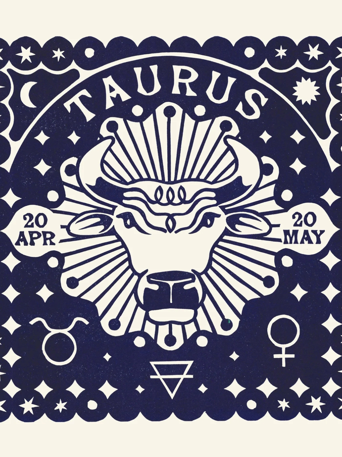 Shown on this print is an approximate date span for Taurus of April 20 – May 20. The dates may vary slightly each year due to Earth's orbit and leap years, so those born near the start or end should check their birth chart to confirm their sign.
