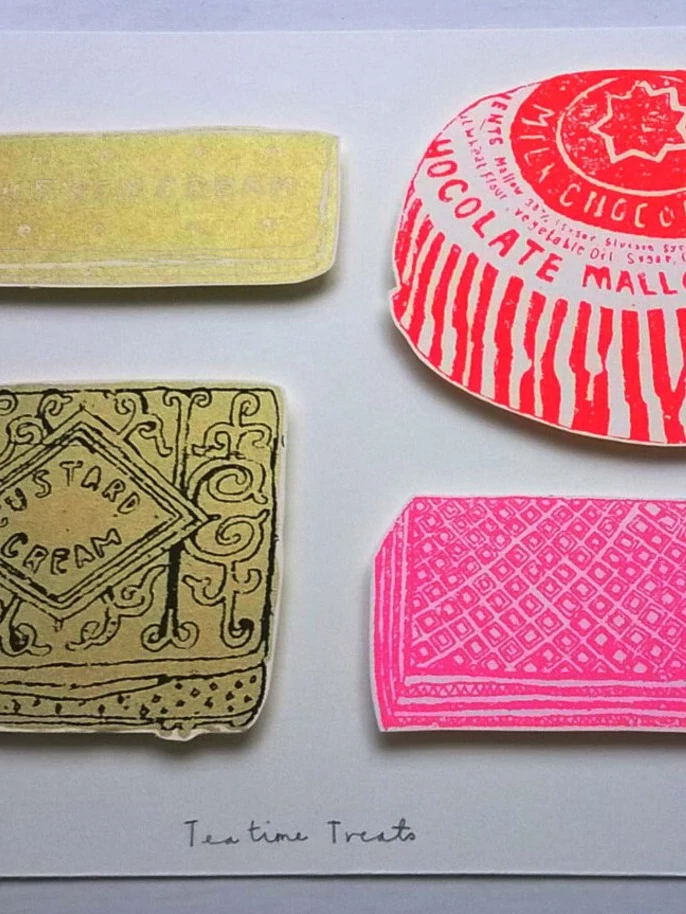Four of the best tea time treat biscuits screen printed by hand and mounted onto italian fabriano artistico paper.