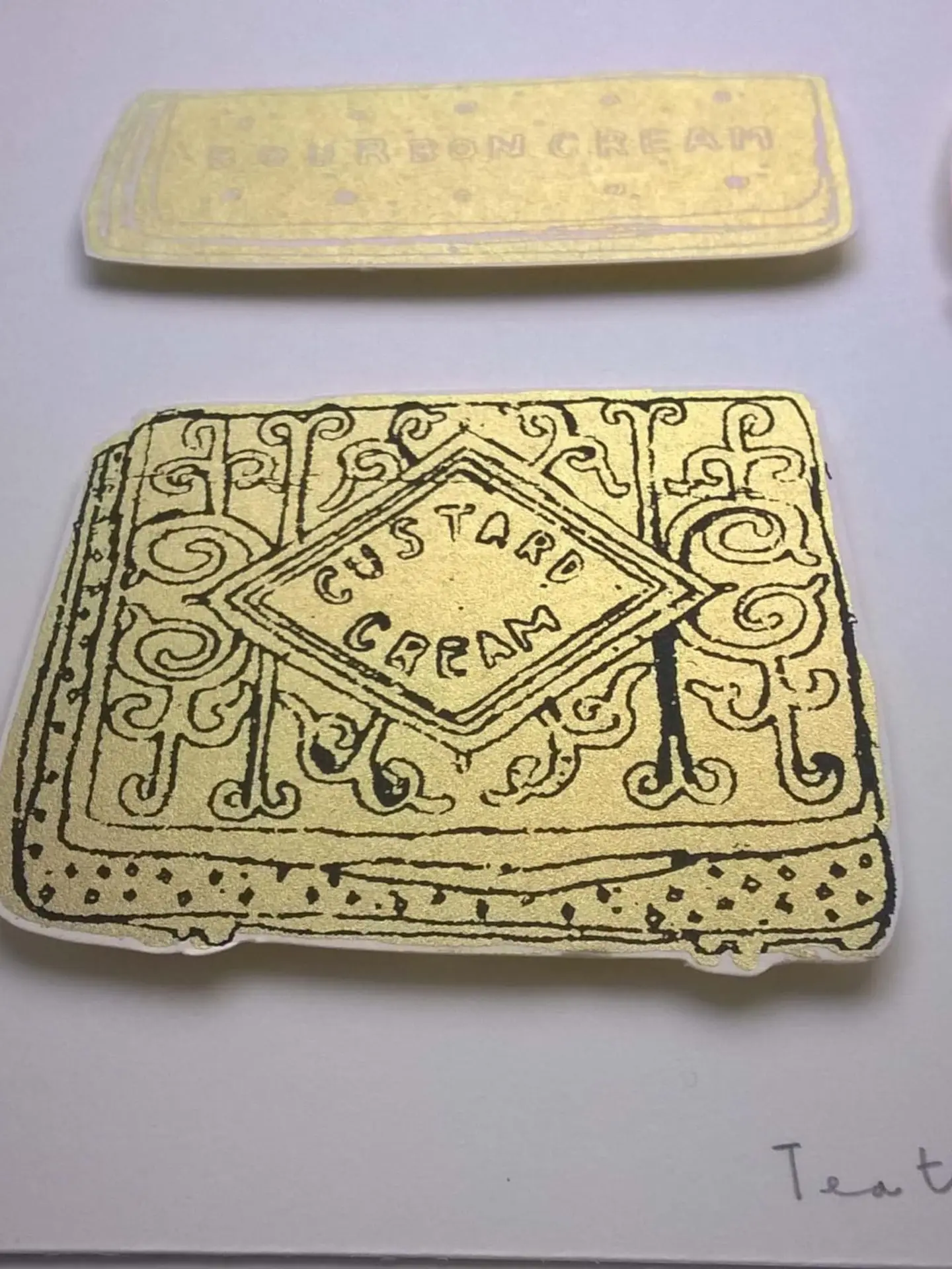 Four of the best tea time treat biscuits screen printed by hand and mounted onto italian fabriano artistico paper...