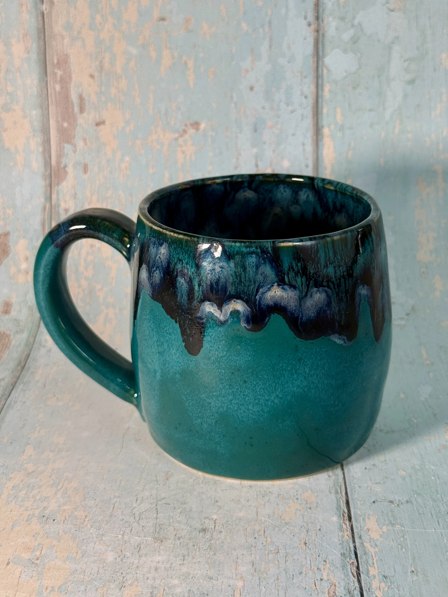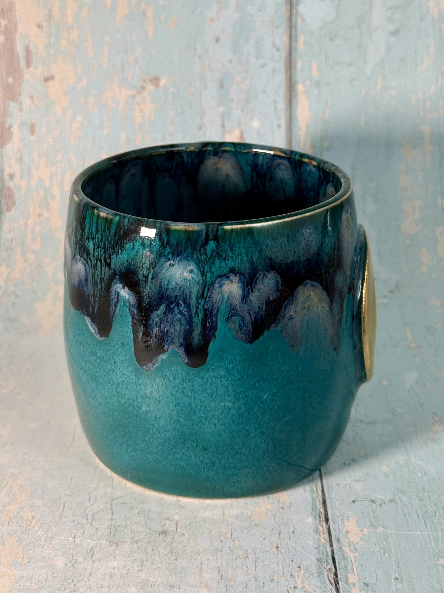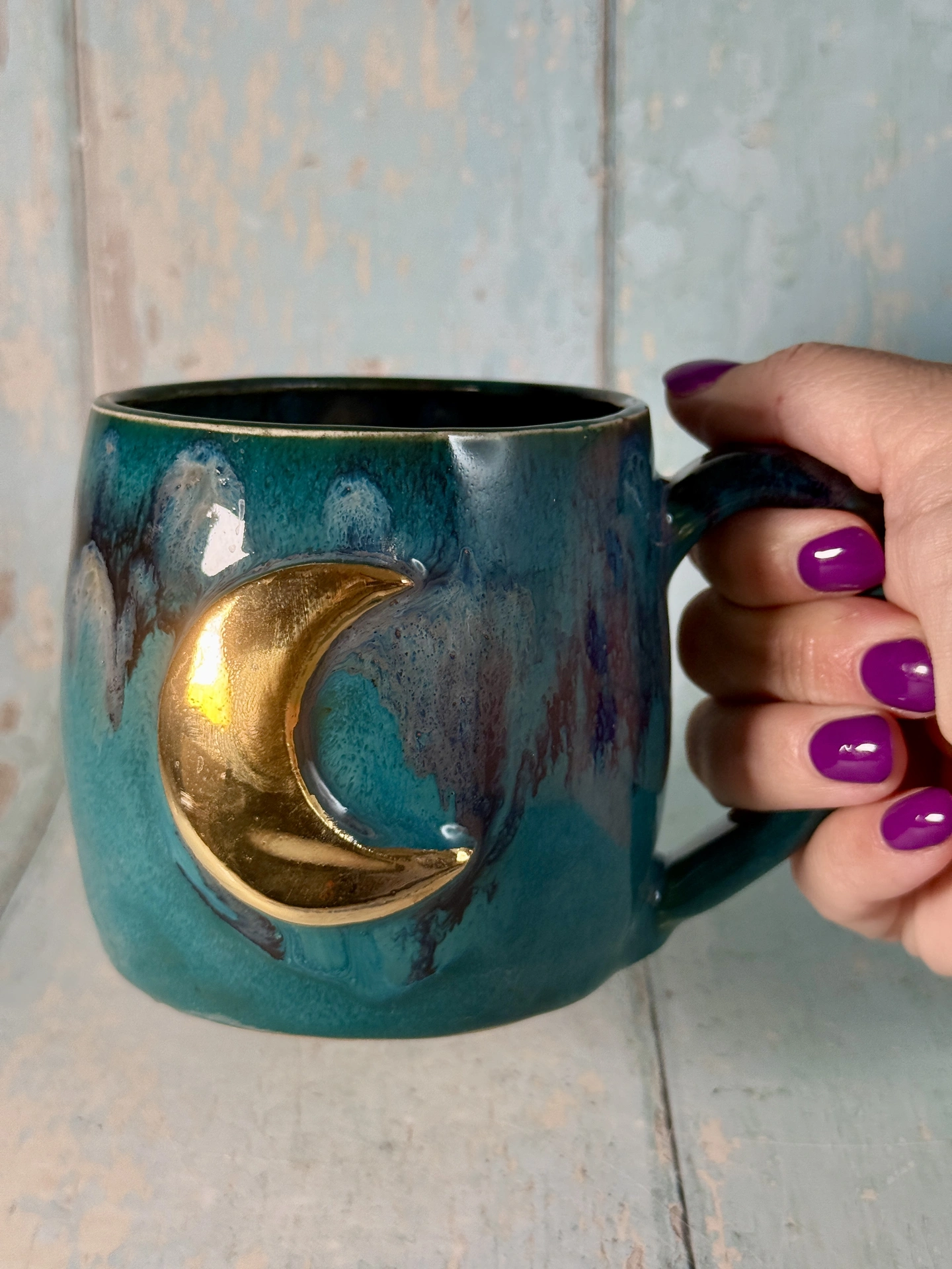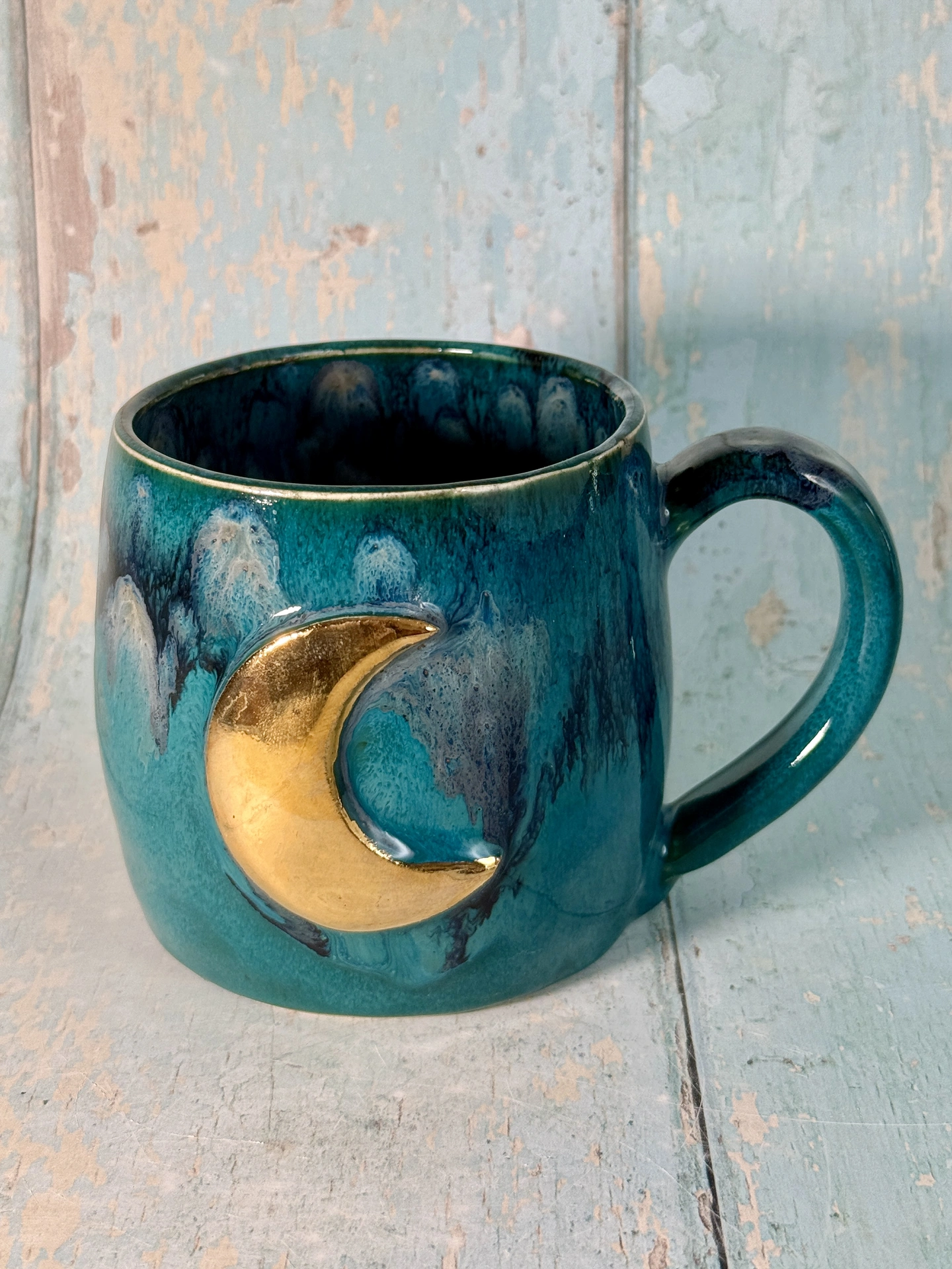 This large handmade Teal moon mug has a beautiful real gold crescent moon.