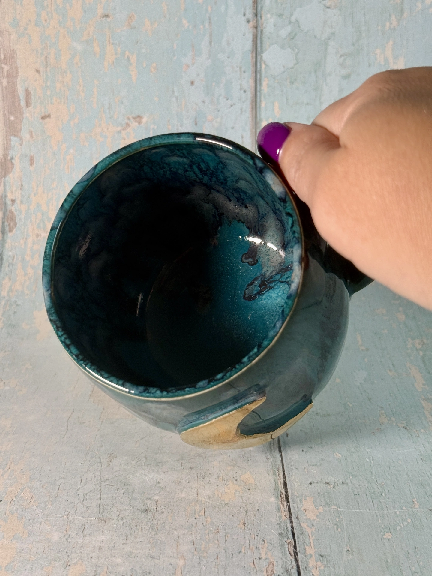 This large handmade Teal moon mug has a beautiful real gold crescent moon...