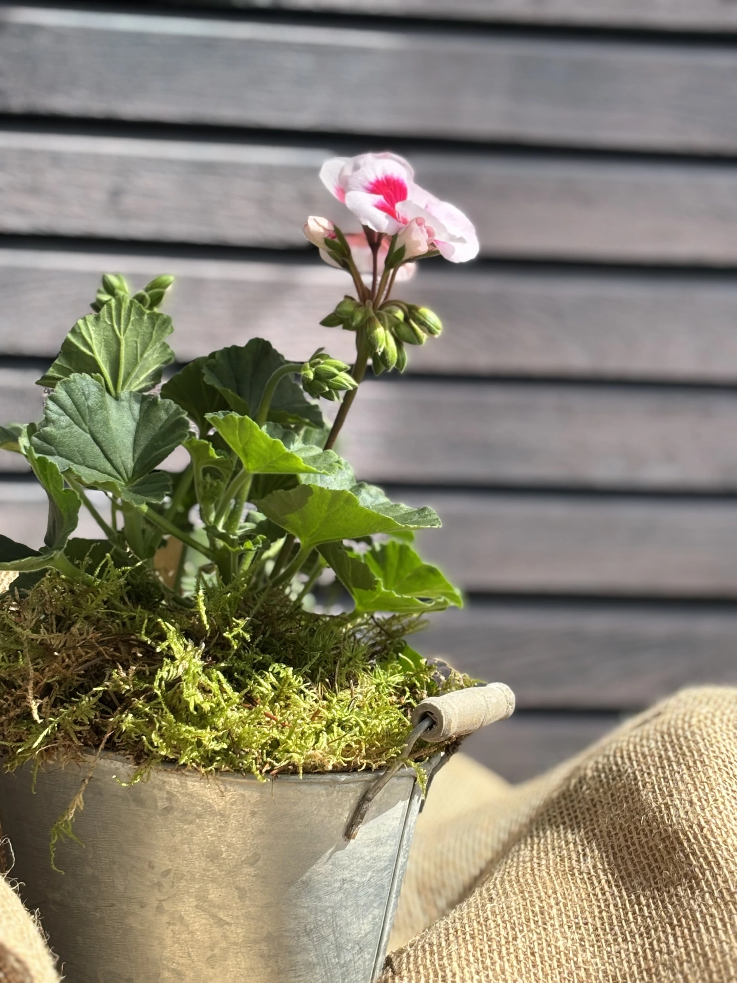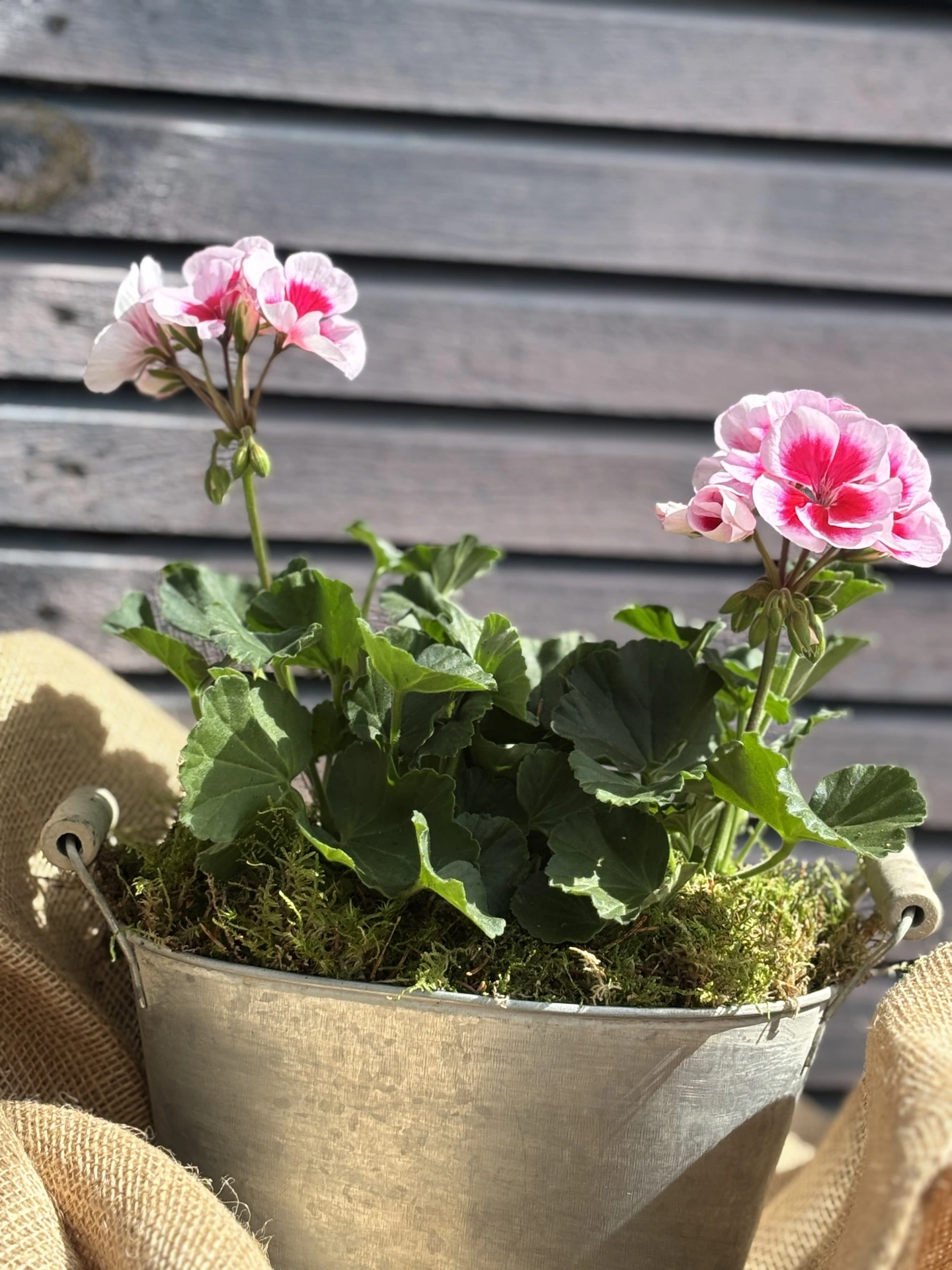 We have created this gorgeous vintage style planter with wooden handles with gorgeous blooming pink two-toned geraniums - Pelargonium Zonale. The perfect Spring gift......