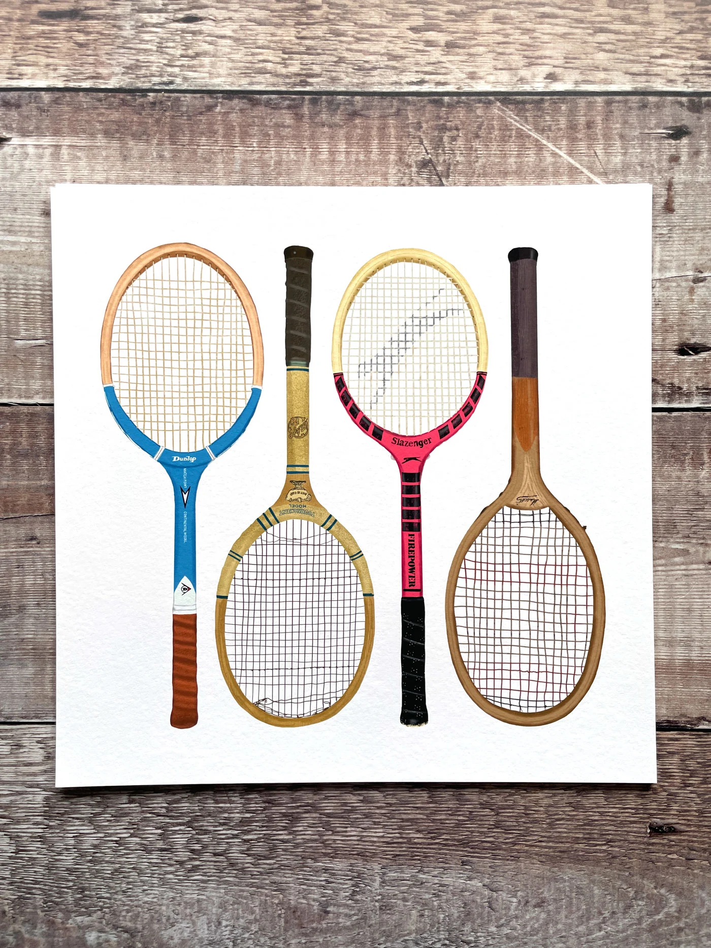 A hand-drawn line-up of vintage tennis racquets — each one illustrated with careful attention to its distinctive shape, string pattern, and well-worn grip. Bold, characterful, and full of the nostalgic charm of a game that looked rather different before graphite and sponsorship logos took over.