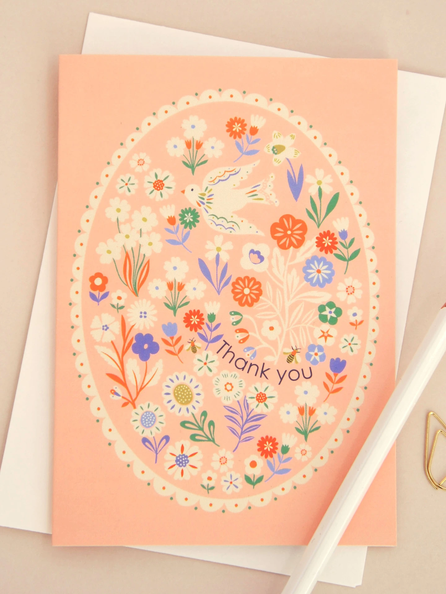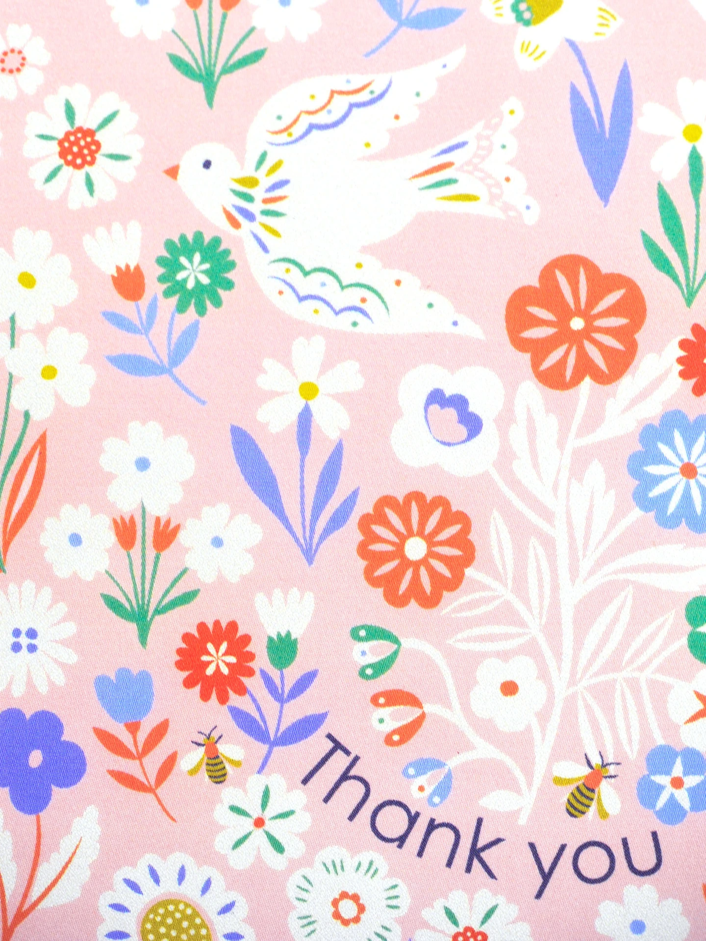 Say thank you beautifully with this illustrated thank you card, featuring a delicate bird and ditsy bees nestled within a meadow of flowers and framed by a pretty decorative border. Set on a creamy pink background with soft accents of orange, blue and green, this design feels gentle, joyful and full of thoughtful detail.