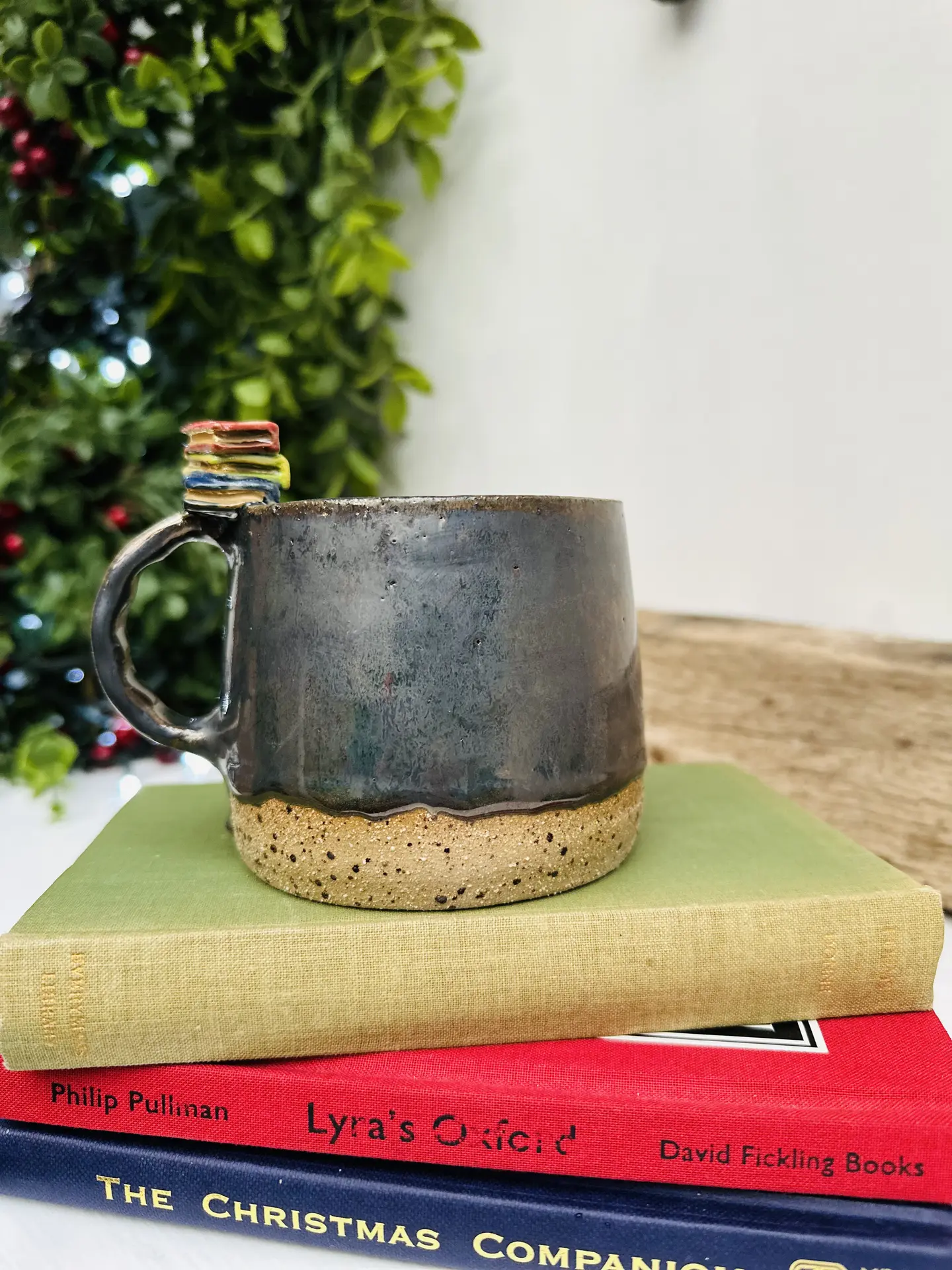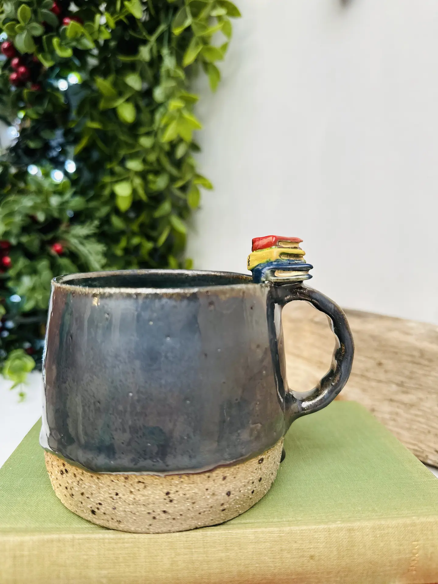 Wrap your hands around a story with this one-of-a-kind hand-thrown ceramic mugs, featuring a whimsical stack of three colourful books perched on the handle. Perfect for the book lovers, writers, teachers, or anyone who finds comfort in a good read and a warm cup.