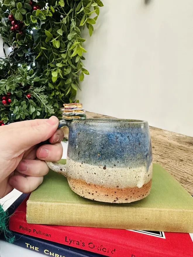 Each mug is individually wheel-thrown, shaped with care - not are ever alike. the books are painted in vibrant glazes, while their delicate pages shimmer in genuine 24-carat gold, adding a touch of luxury and magic to your daily ritual.