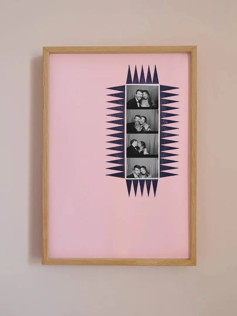 Sized to fit an A4 frame (frame recommendations below), with an aperture cut to fit a photo booth strip sized 44x128mm. Please do check your photo booth strip dimensions before ordering as not all photo booths are sized the same!