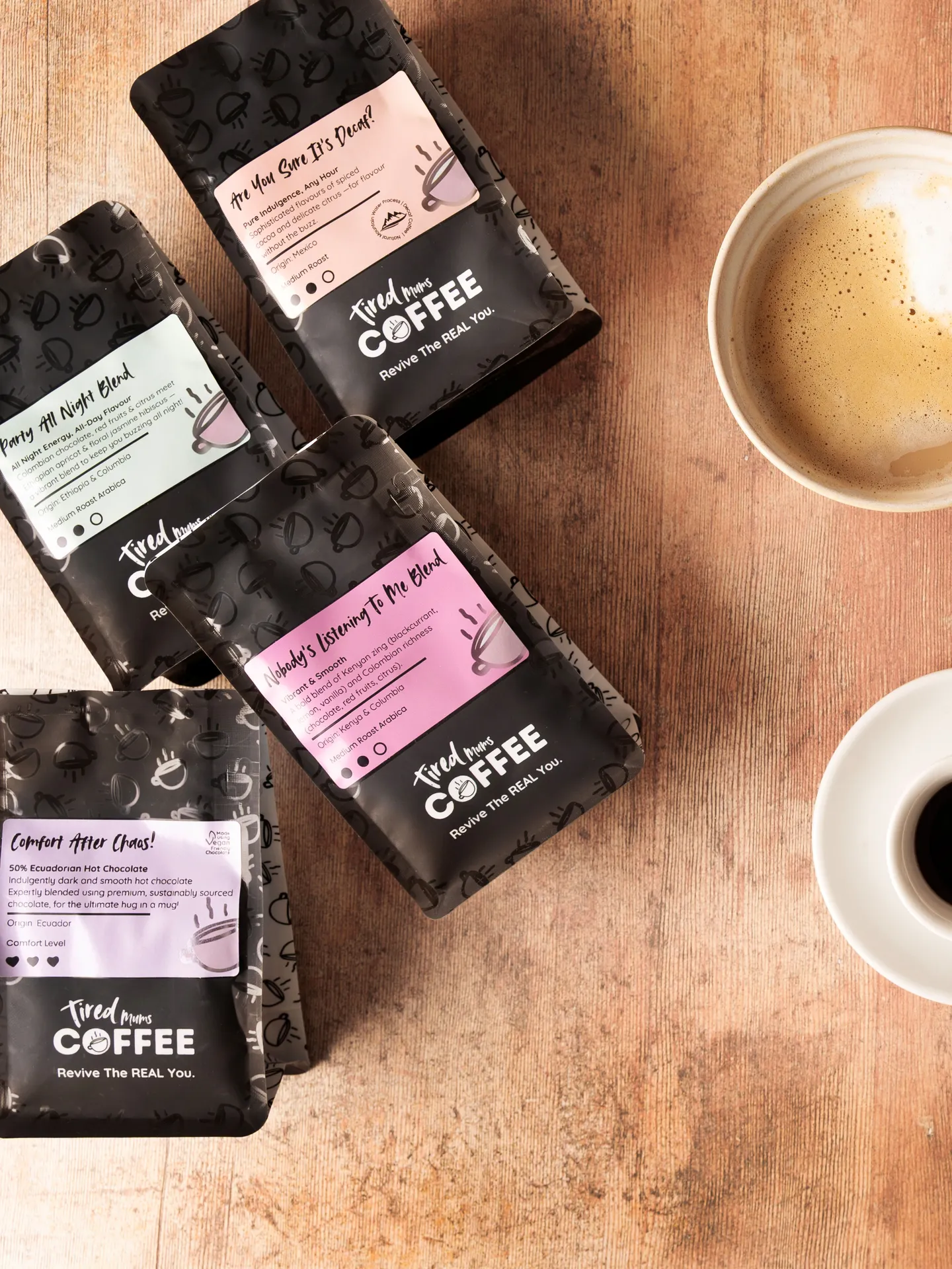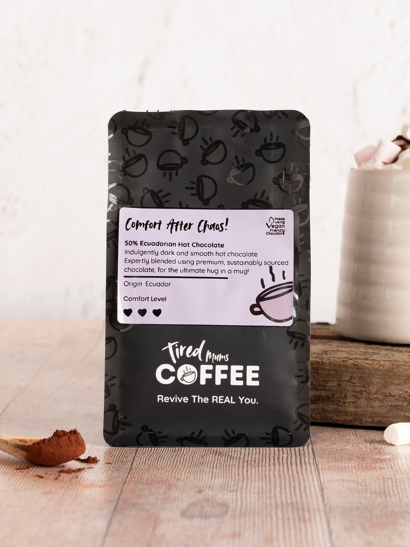 From an instant morning wake up with our 'Party All Night' blend to a pick-me-up of 'Nobody's Listening to Me' both perfect to keep the day on track. Through to an afternoon or evening cup of 'Are You Sure it's Decaf?', mountain water washed and carefully blended to provide all the flavour without the buzz! And after the madness of the day, unwind with our 'Comfort After Chaos' luxury dark hot chocolate for the ultimate hug in a mug!