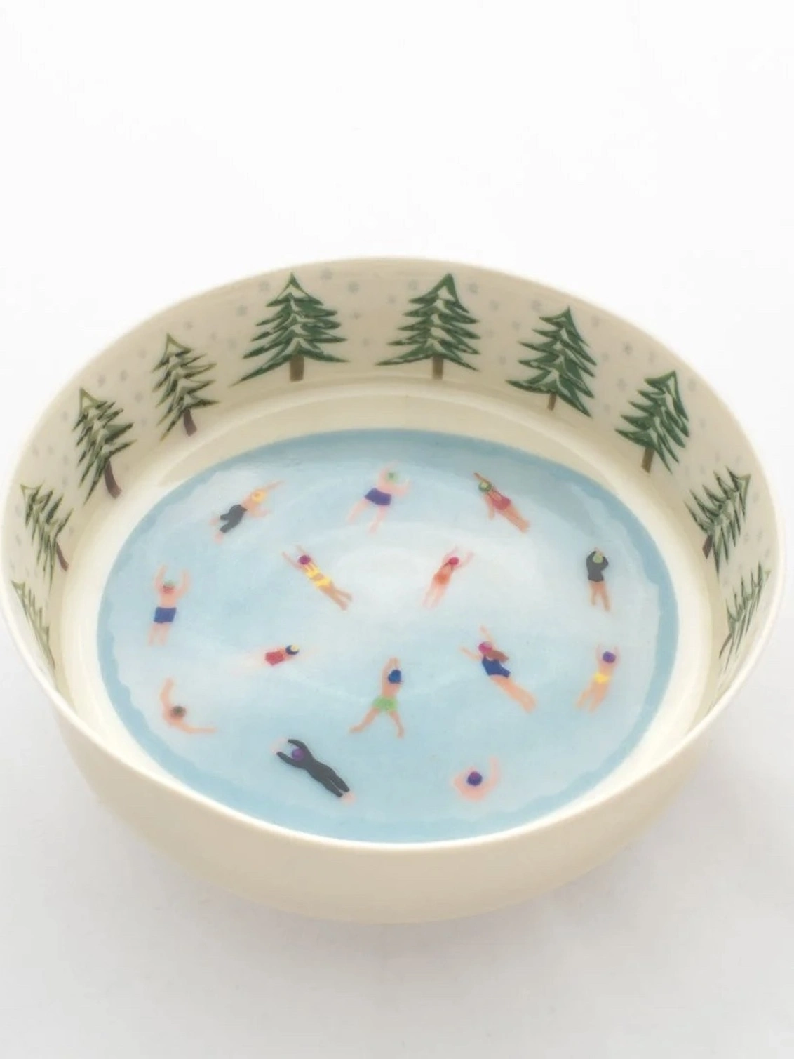 Small hand made decorative porcelain dish measuring approx 12.5cm in diameter by 3.5cm in height. It is internally glazed and decorated with winter swimmers in an icy lake surrounded by snow covered forest. The perfect gift anyone who loves to escape into nature!