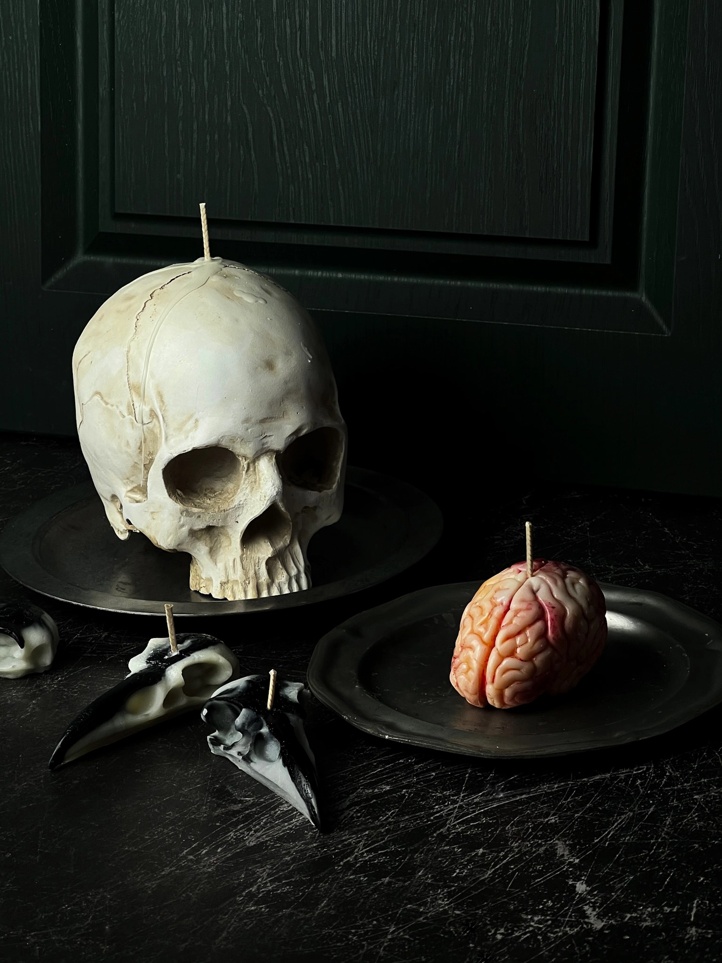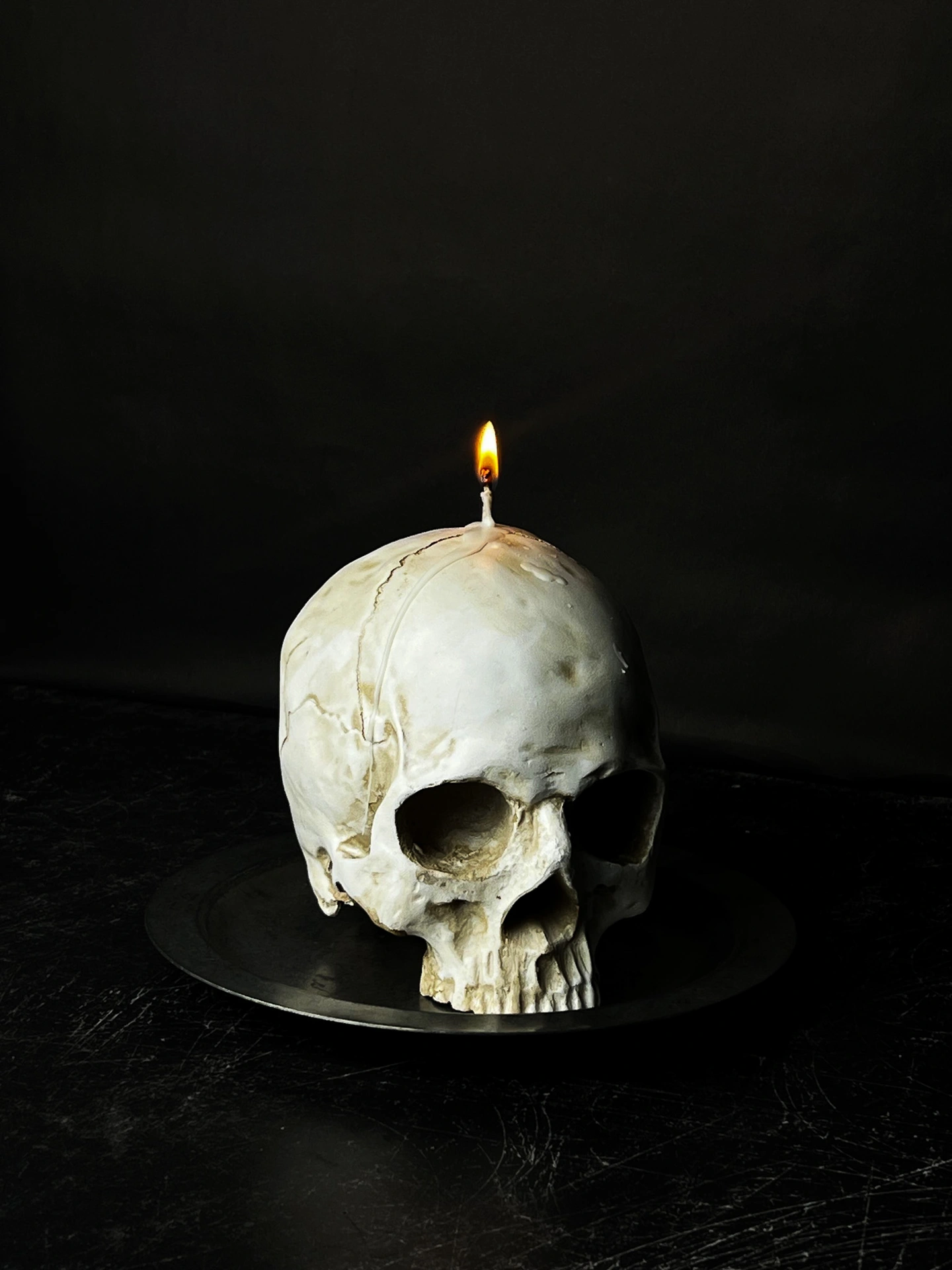 In this rare creation, the Human Skull Candle stands as a relic of beauty and mortality, a life-sized wax effigy, hand-finished to mirror the fragile elegance of ancient bone, timeworn and eternal. Every hollow, curve, and fissure tells a story; a whisper of what once was and what remains.