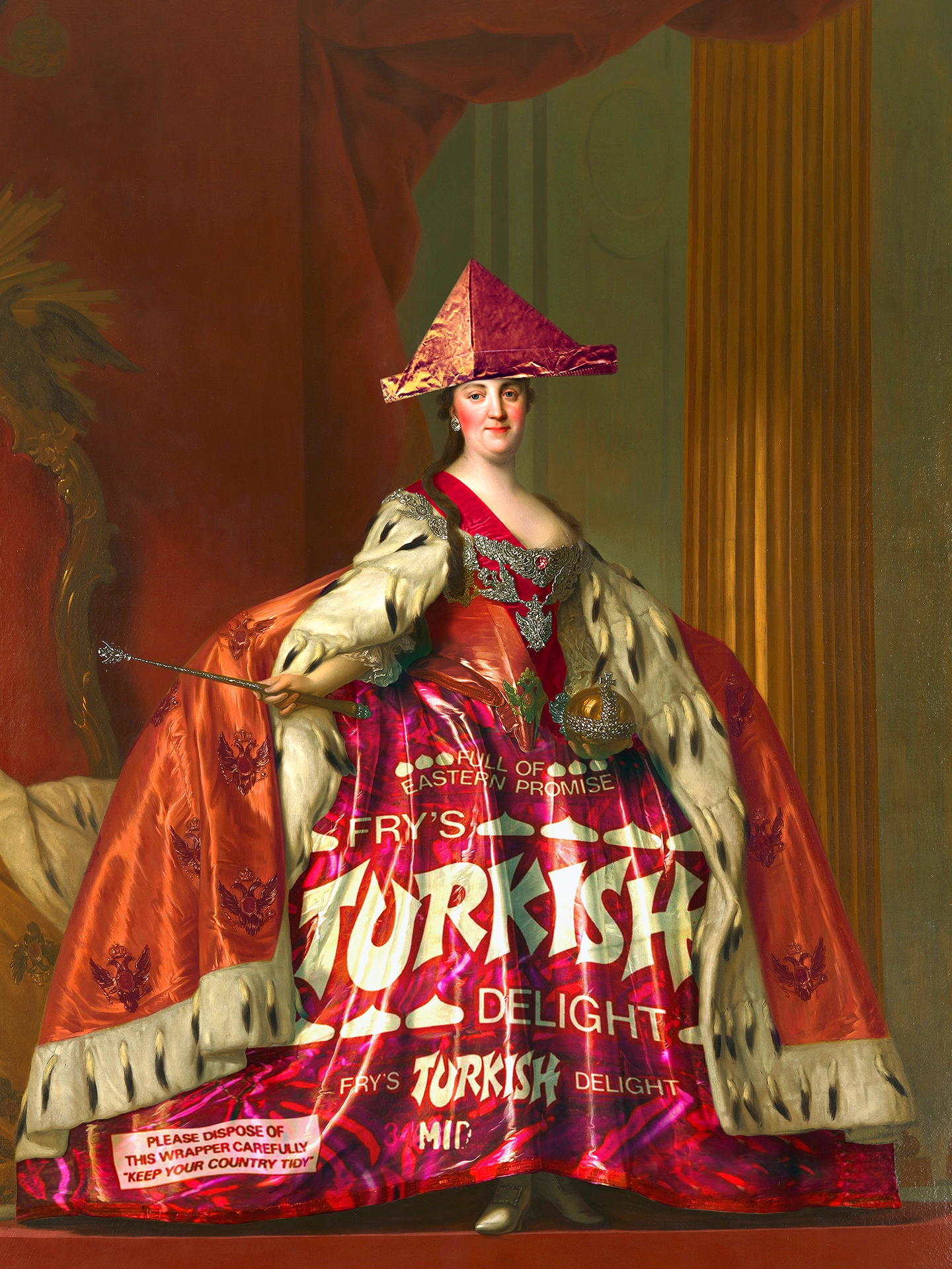 Part of a large ongoing series of works called The Product Placement Project. Humorous & fun Pop-Surrealist work exploring the connections and boundaries between art and advertising and a reflection on the functions of fashion & clothing