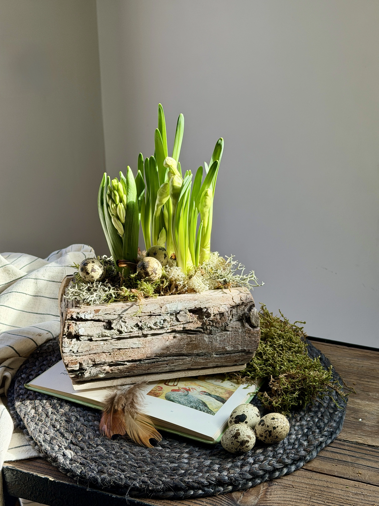 Delicate feathers and quail eggs are nestled among the planting, evoking the feeling of a hidden woodland nest and adding a whimsical touch perfect for the Easter season. As the bulbs grow and bloom, the trough transforms into a living display of springtime, filling the air with scent and bringing joyful colour to windowsills, patios, or Easter tables