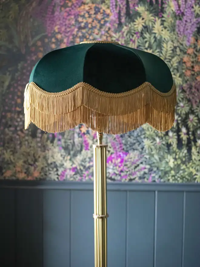 This green goddess of a lampshade is the epitome of Art Deco elegance. Created in sumptuous emerald-green velvet, it’s trimmed with golden braiding and two-tone swishy fringing that adds a little extra texture and a whole lot of impact. Every single Tinke...
