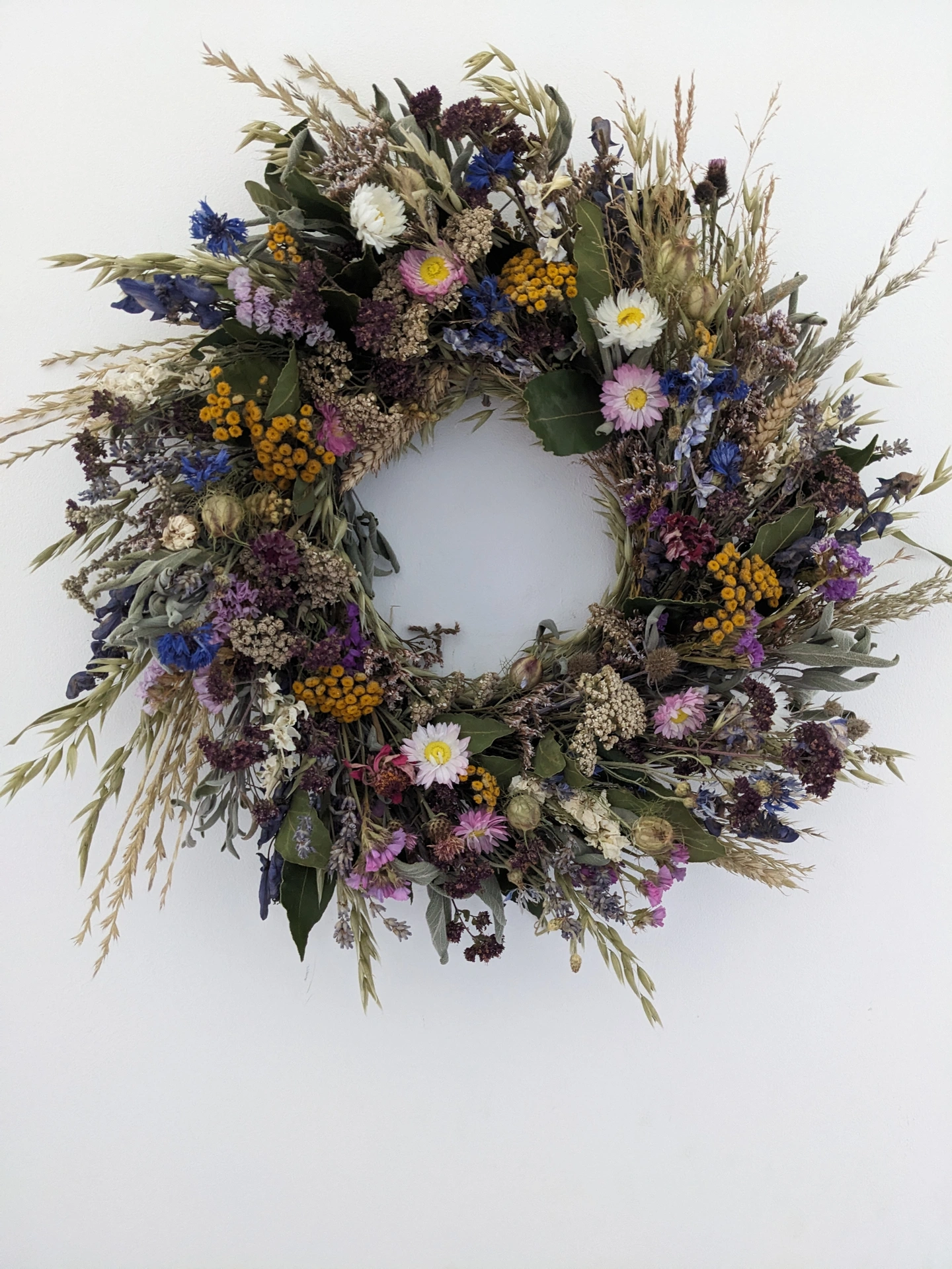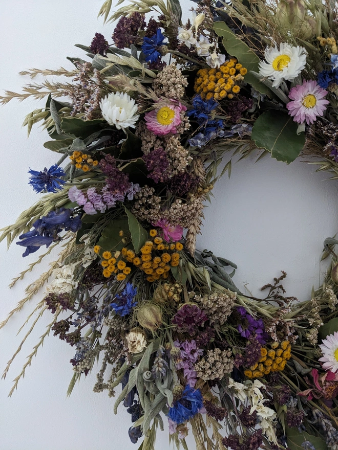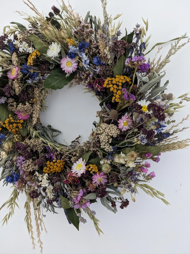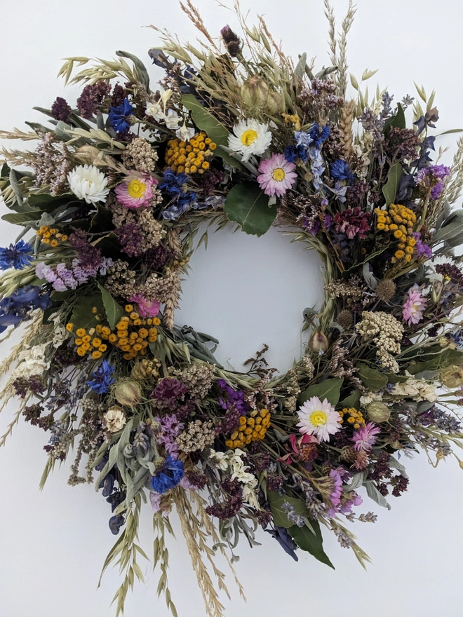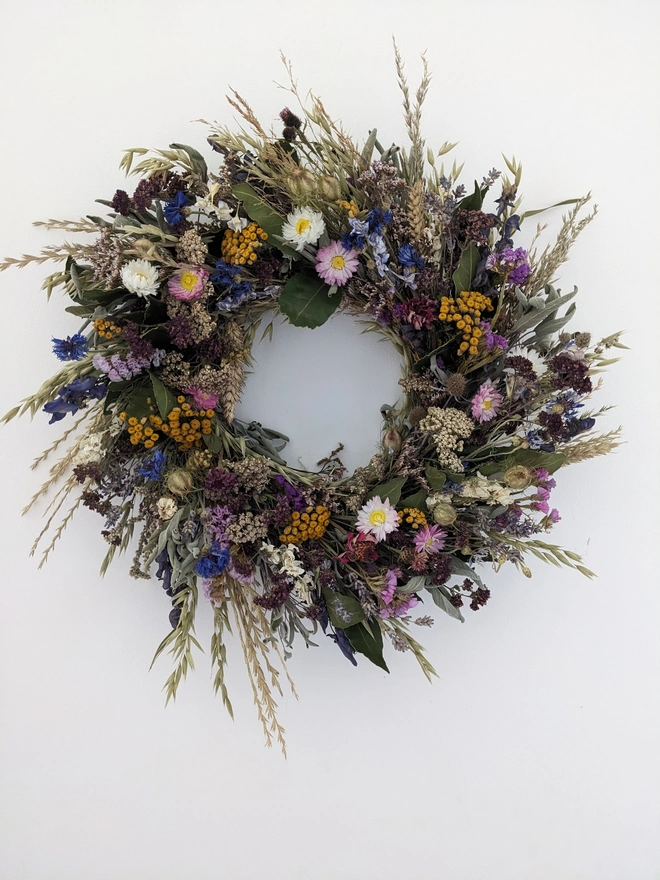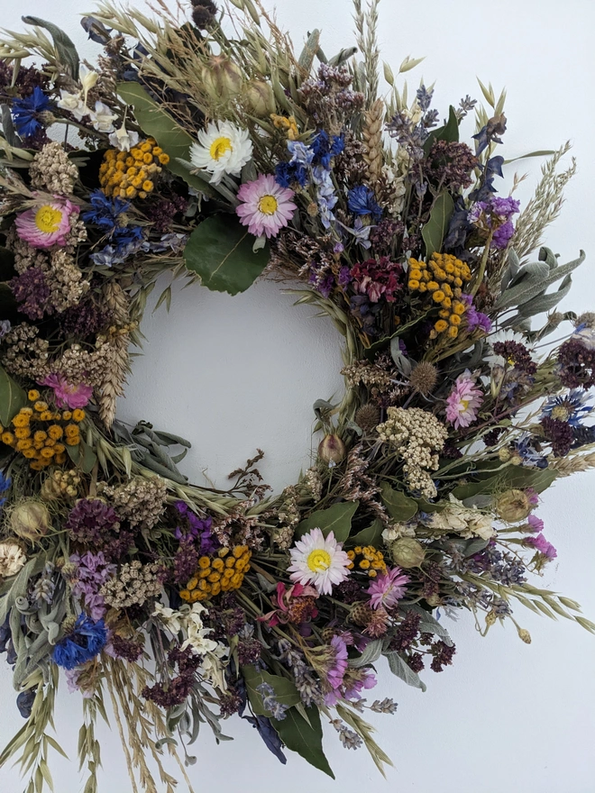 A beautiful handmade wreath inspired by the English countryside, crafted from a mix of organically grown and foraged flowers gathered in West Sussex.
