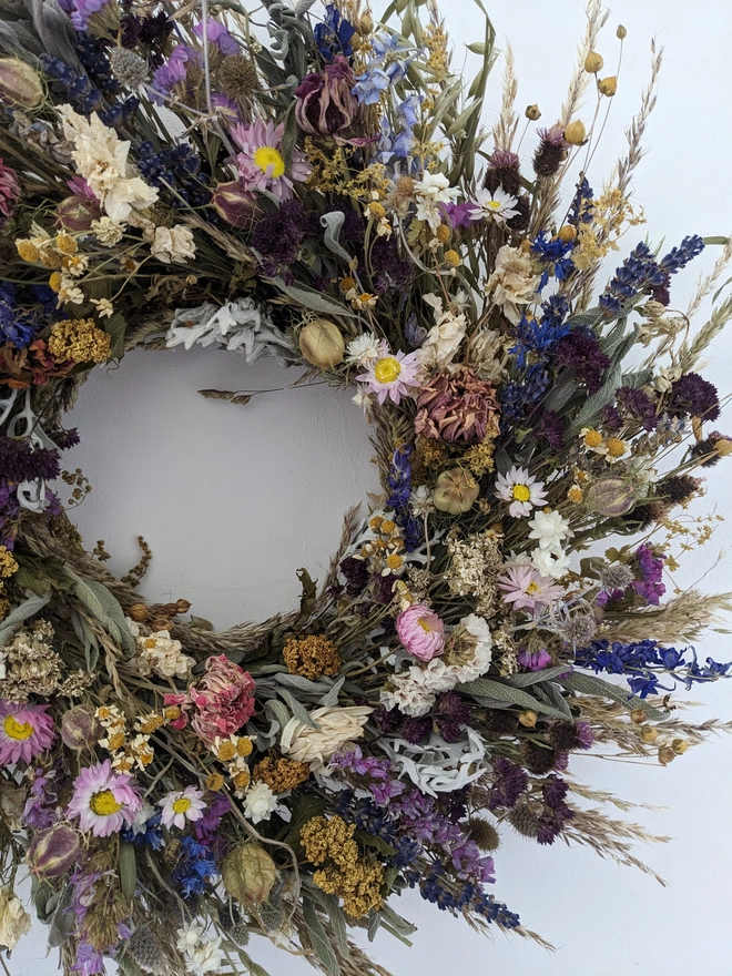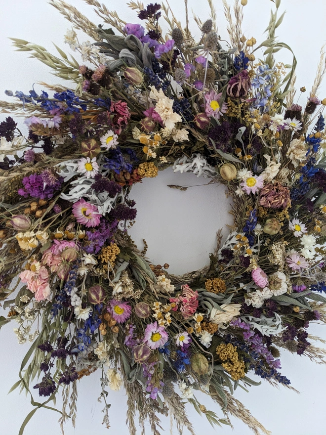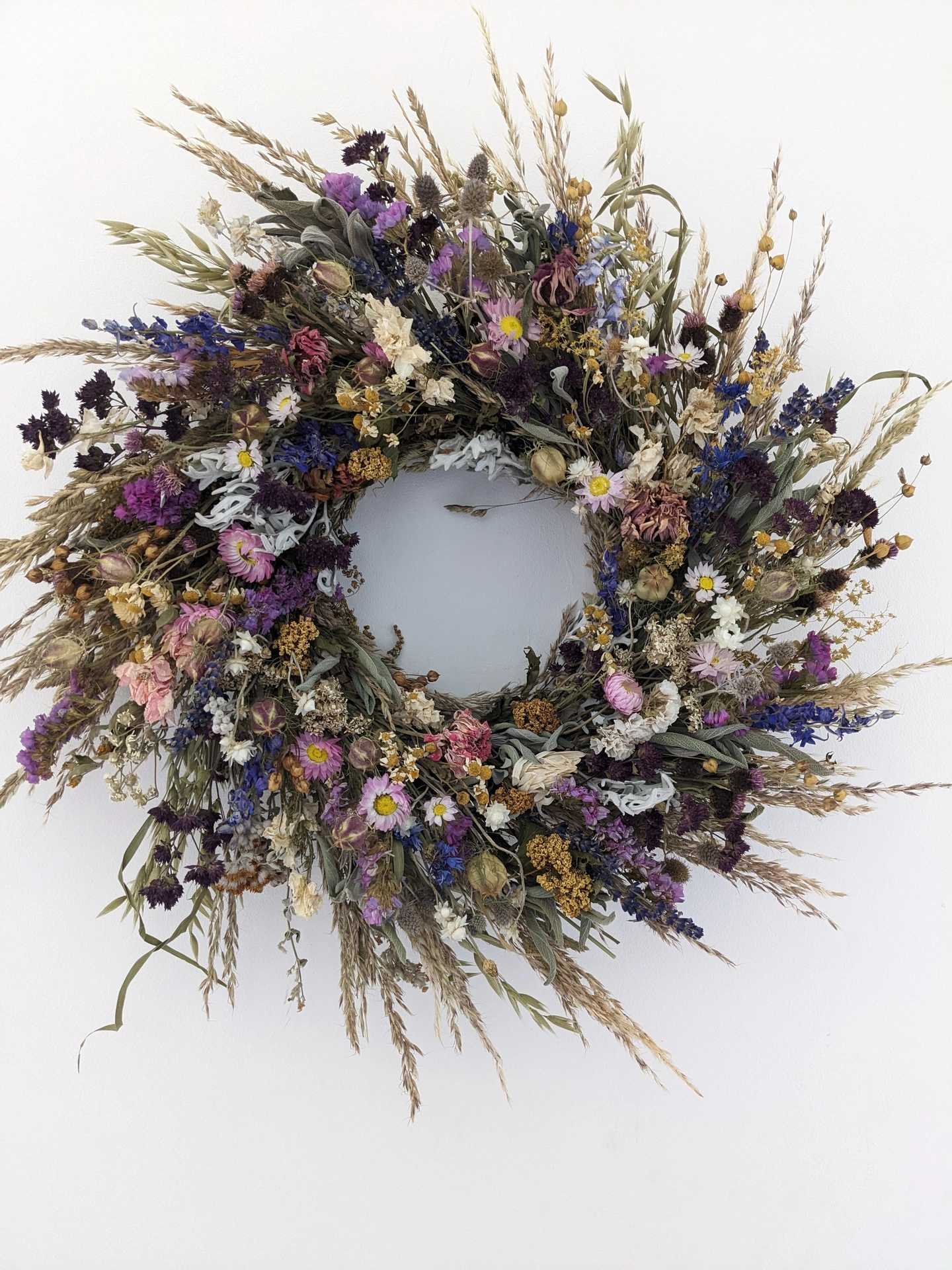 A beautiful handmade wreath inspired by the English countryside, crafted from a mix of organically grown and foraged flowers gathered in West Sussex.