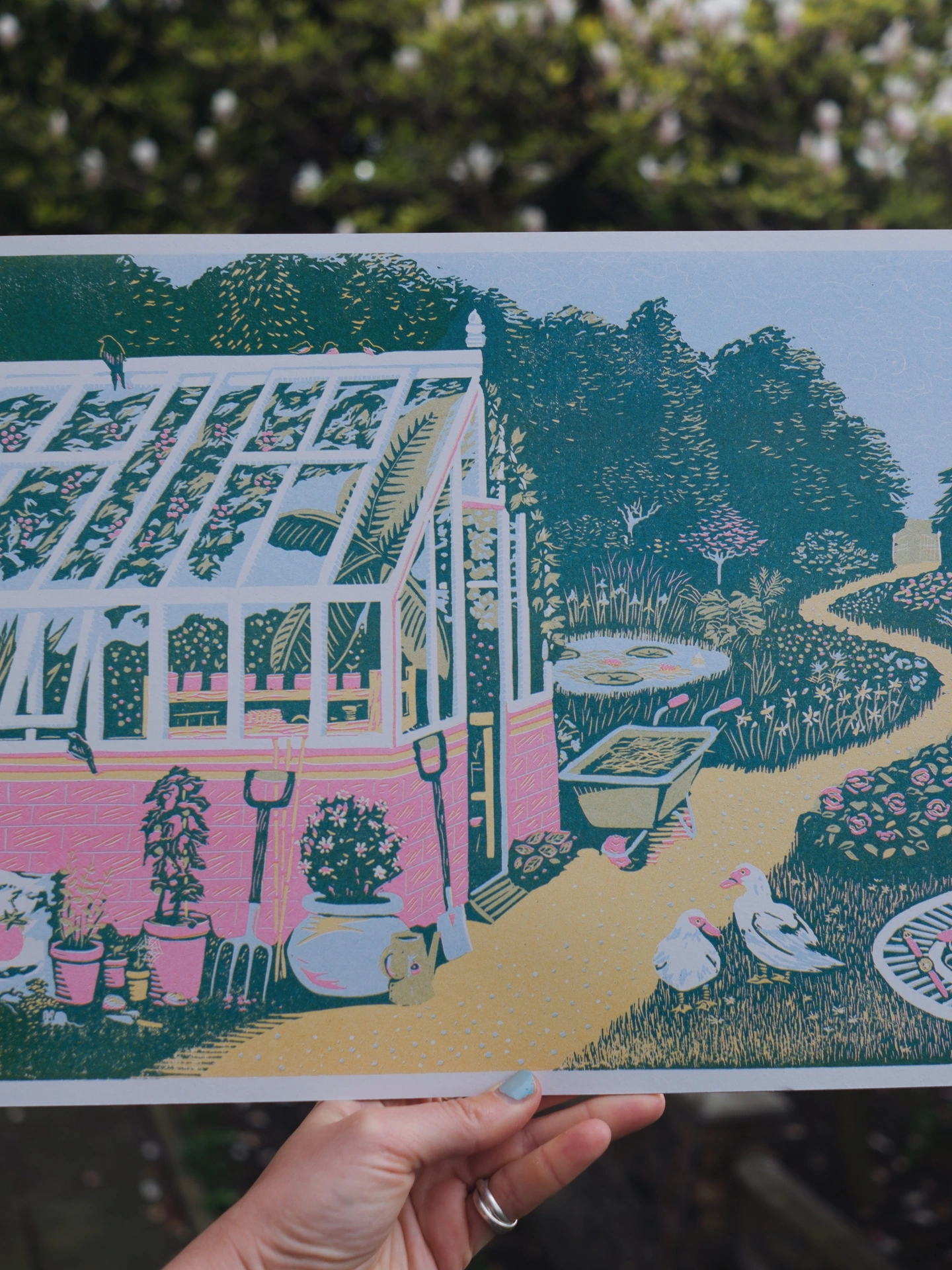A peaceful garden and greenhouse scene, filled with details.