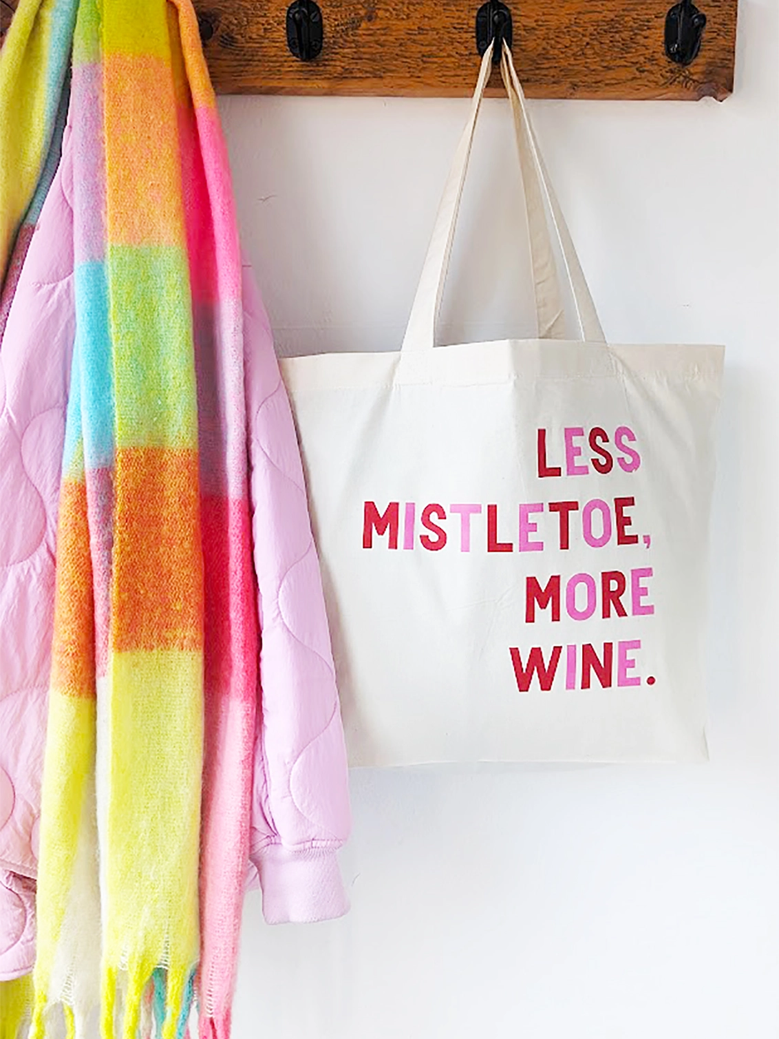 …Carry your Christmas snacks and fizz in style with the Less Mistletoe More Wine tote bag.