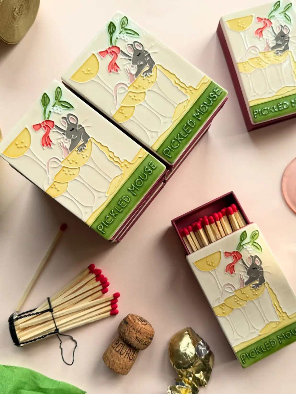 The ceramic artwork sits atop a luxury card case with striker strip. Each box contains 40 coloured extra long safety matches.