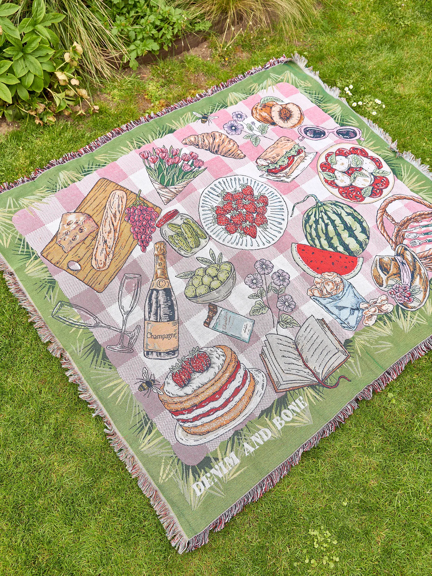 Designed with picnics in mind, our Woven Throw brings the joy of outdoor dining wherever you are. Featuring a hand-illustrated spread of picnic essentials—berries, fresh bread, champagne, watermelon, and more—this vibrant throw sets the scene on a cl...