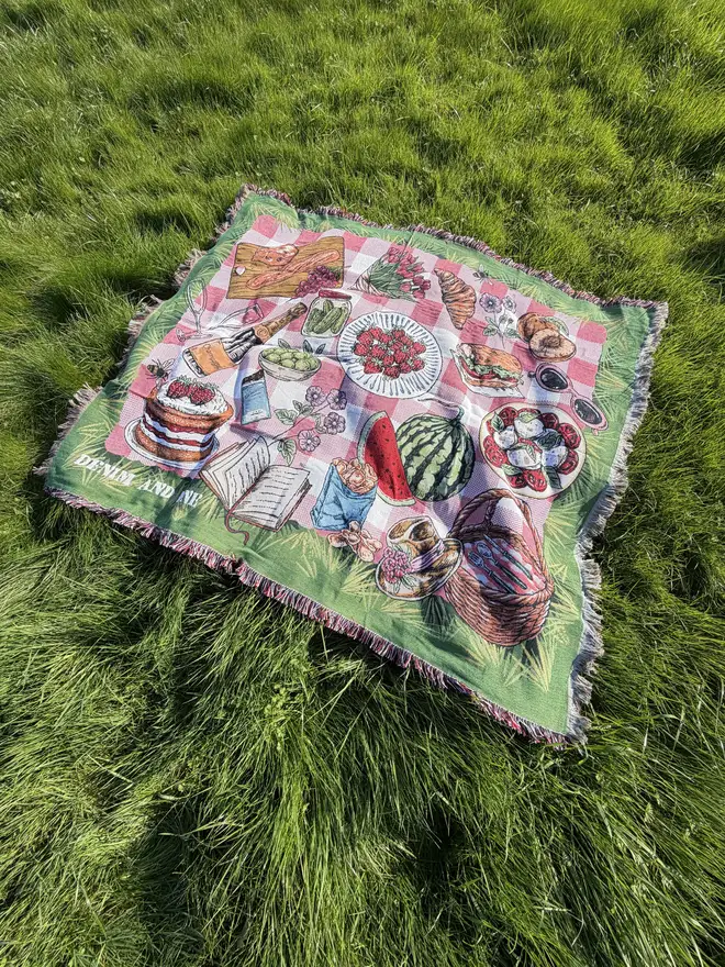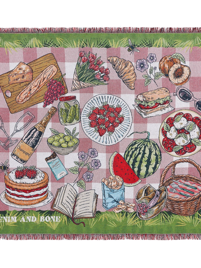 Designed with picnics in mind, our Woven Throw brings the joy of outdoor dining wherever you are. Featuring a hand-illustrated spread of picnic essentials—berries, fresh bread, champagne, watermelon, and more—this vibrant throw sets the scene on a classic gingham backdrop, bordered by lush grass for a whimsical finish.