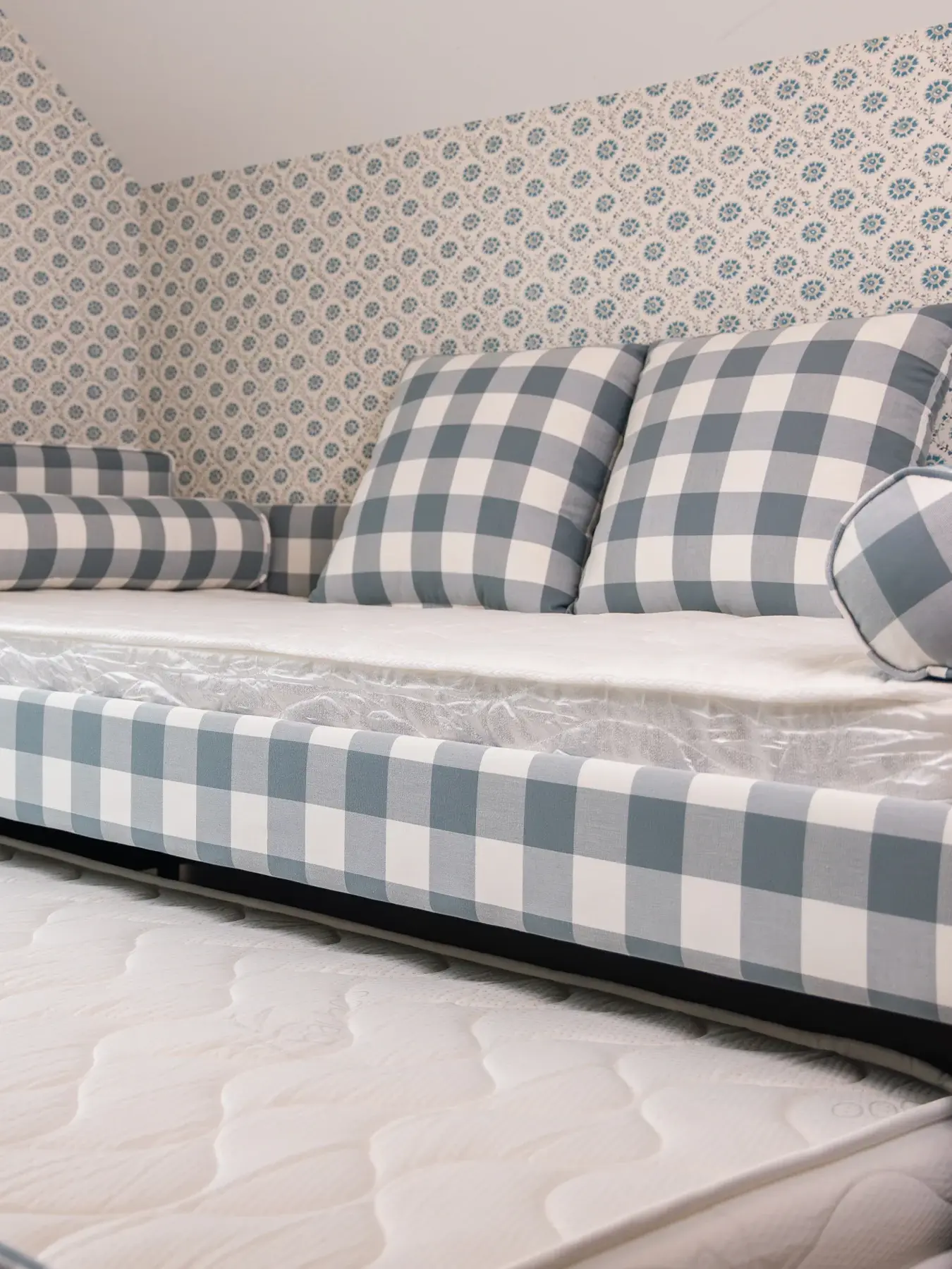 This daybed features a pull-out drawer that transforms into a second bed, perfect for playdates and sleepovers. Our blue gingham upholstery adds charm to any children's room.