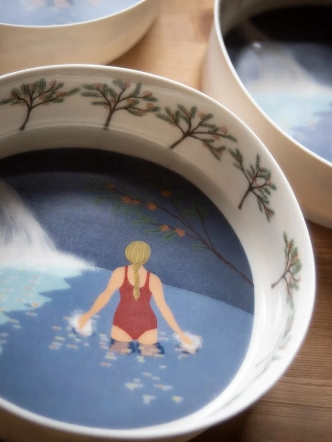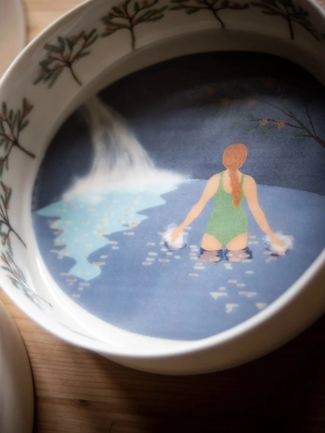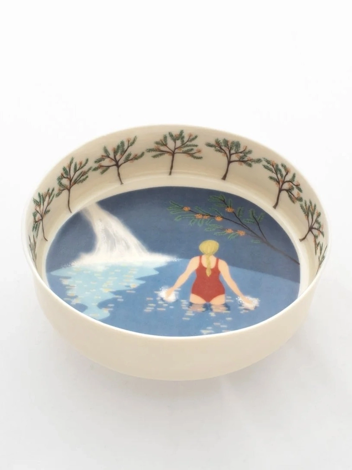The piece itself is a small hand made decorative porcelain dish measuring approx 12.5cm in diameter by 3.5cm in height. It is internally glazed. To reflect the spirit of wild swimmers themselves each bowl is completely individual, often slightly irregular, with its own characteristics and always wonderfully unrepeatable!