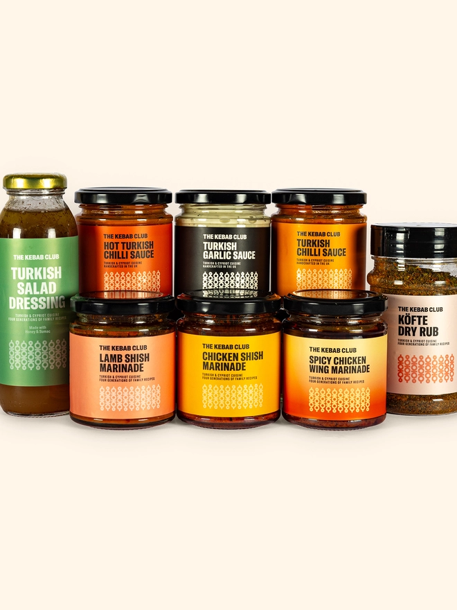 In this ultimate bundle are all 8 of our products; Chicken Shish Marinade, Lamb Shish Marinade, Spicy Chicken Wing Marinade, Kofte Dry Rub, Turkish Garlic Sauce, Turkish Salad Dressing, Turkish Chilli Sauce, & Hot Turkish Chilli Sauce.