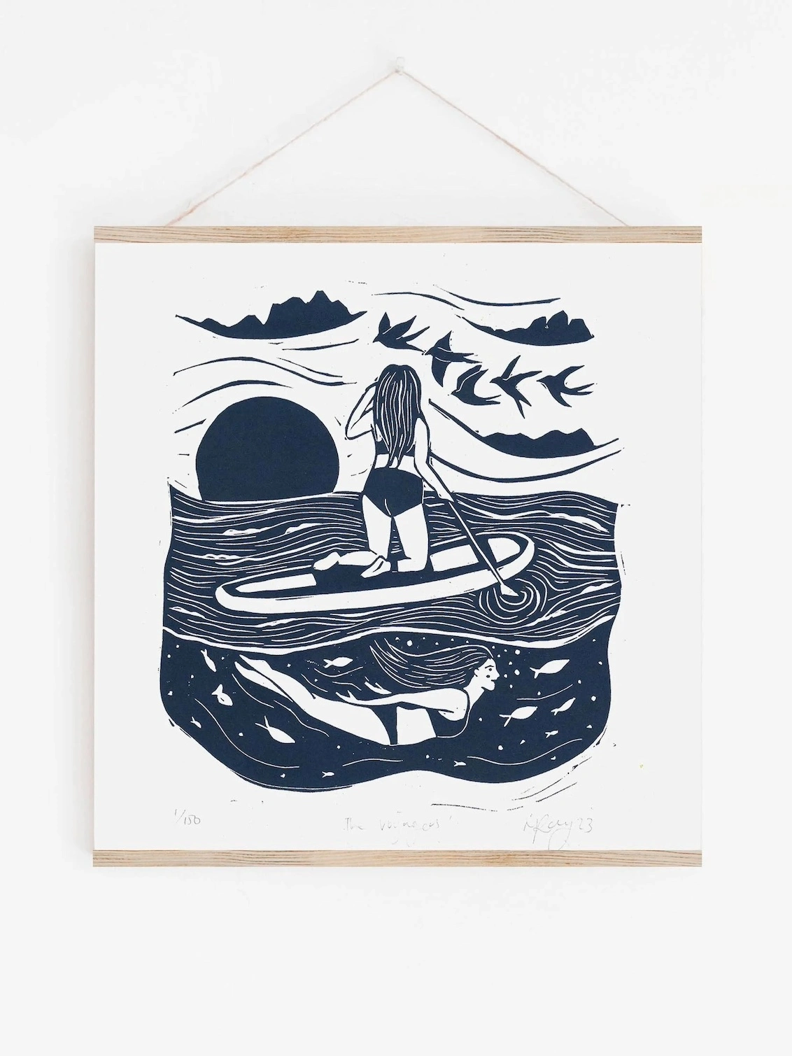 Full of movement and emotion, this linoprint depicts paddle boarding and swimming, and the beauty of the open sea.