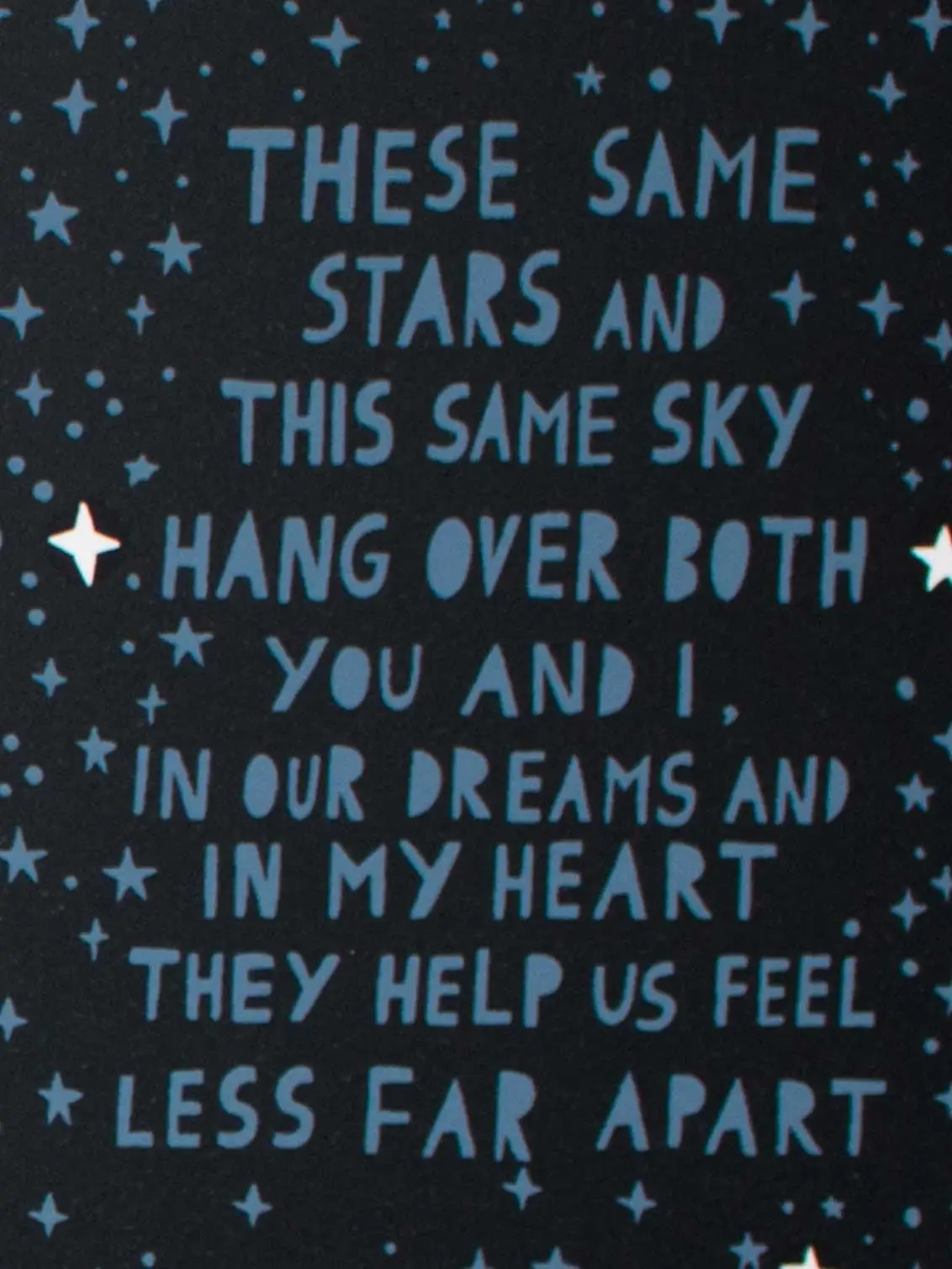 'Every night at the same time I pick a star hold it tight and think of you a thousand miles across land and sea. I feel you in my heart thinking of me. These same stars and this same sky hang over both you and I. In my dreams and in my heart they help us feel less apart.'