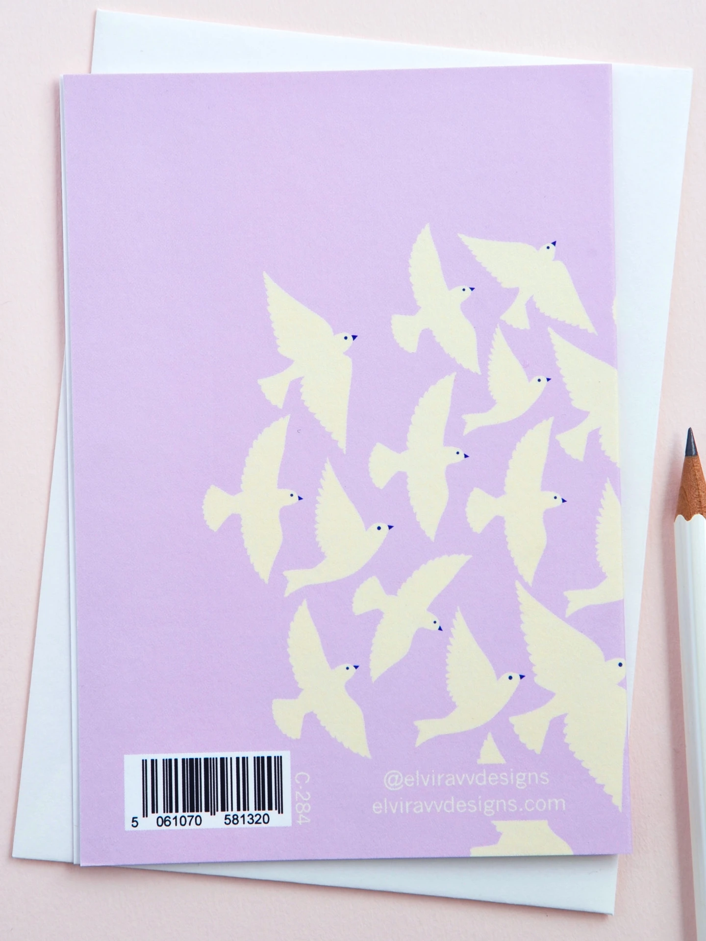 A beautifully calming set of six “Thinking of You” cards featuring a soft lilac background and a gentle pattern of white birds in flight. The serene design offers a warm, heartfelt way to reach out to loved ones, whether you’re sending support, sympathy or simple reassurance.