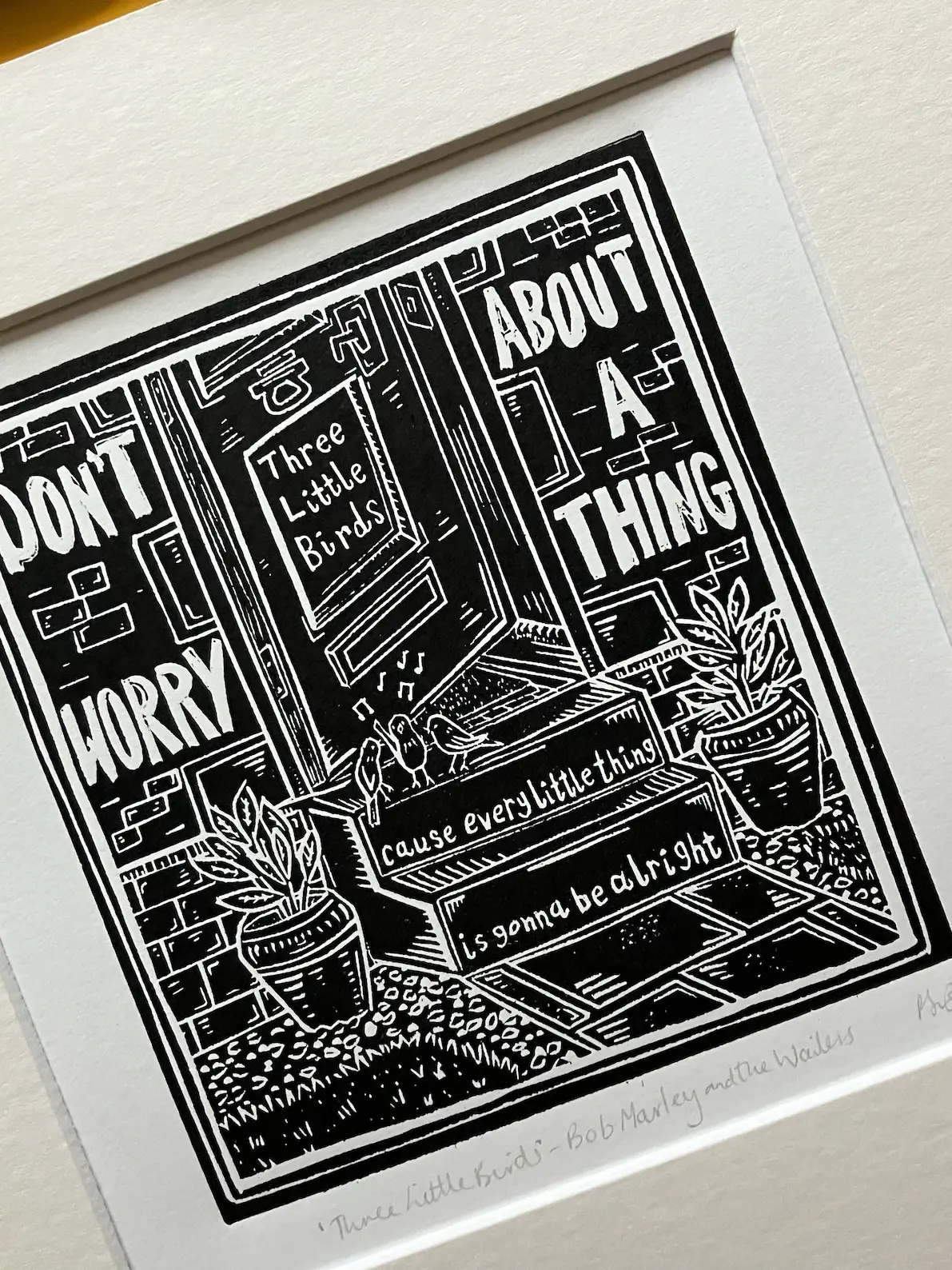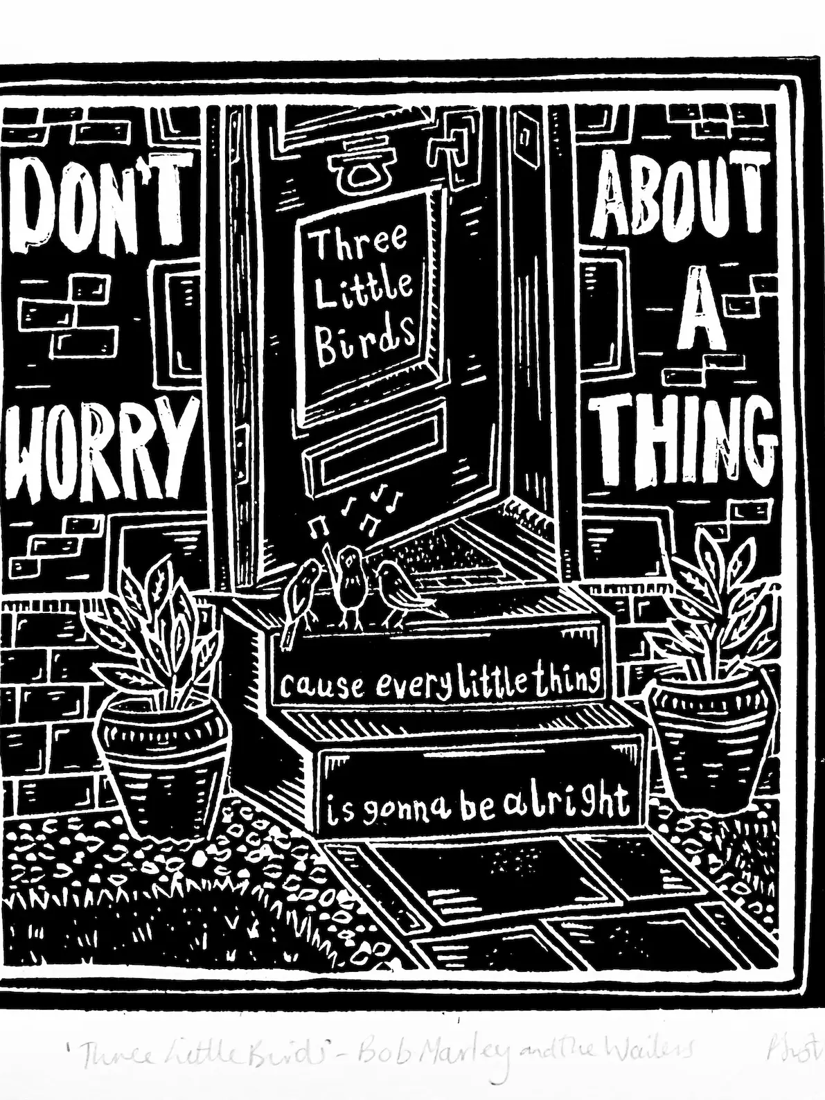 Original linocut print featuring lyrics from the song 'Three Little Birds' by Bob Marley and the Wailers, from the album Exodus.