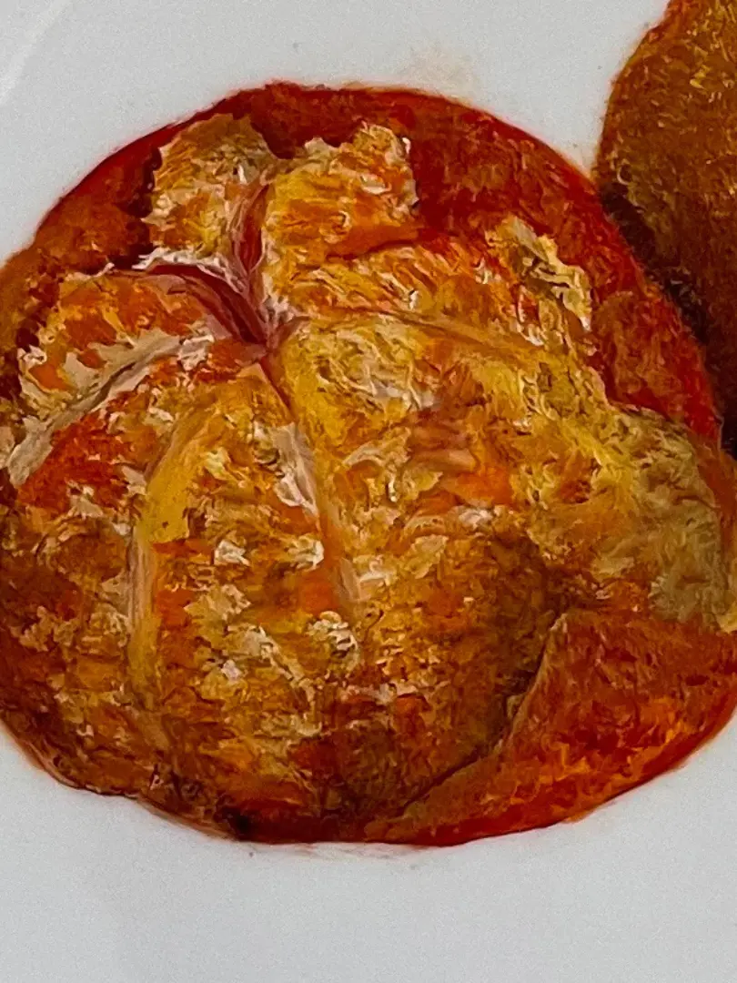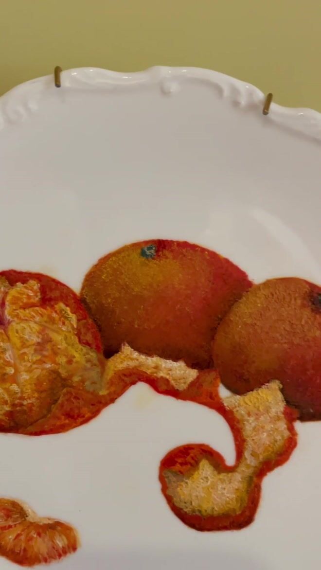 An original fine art painting featuring a three mandarins. Oil painting by renowned artist Jac Scott, on an antique salad plate with a raised rim...