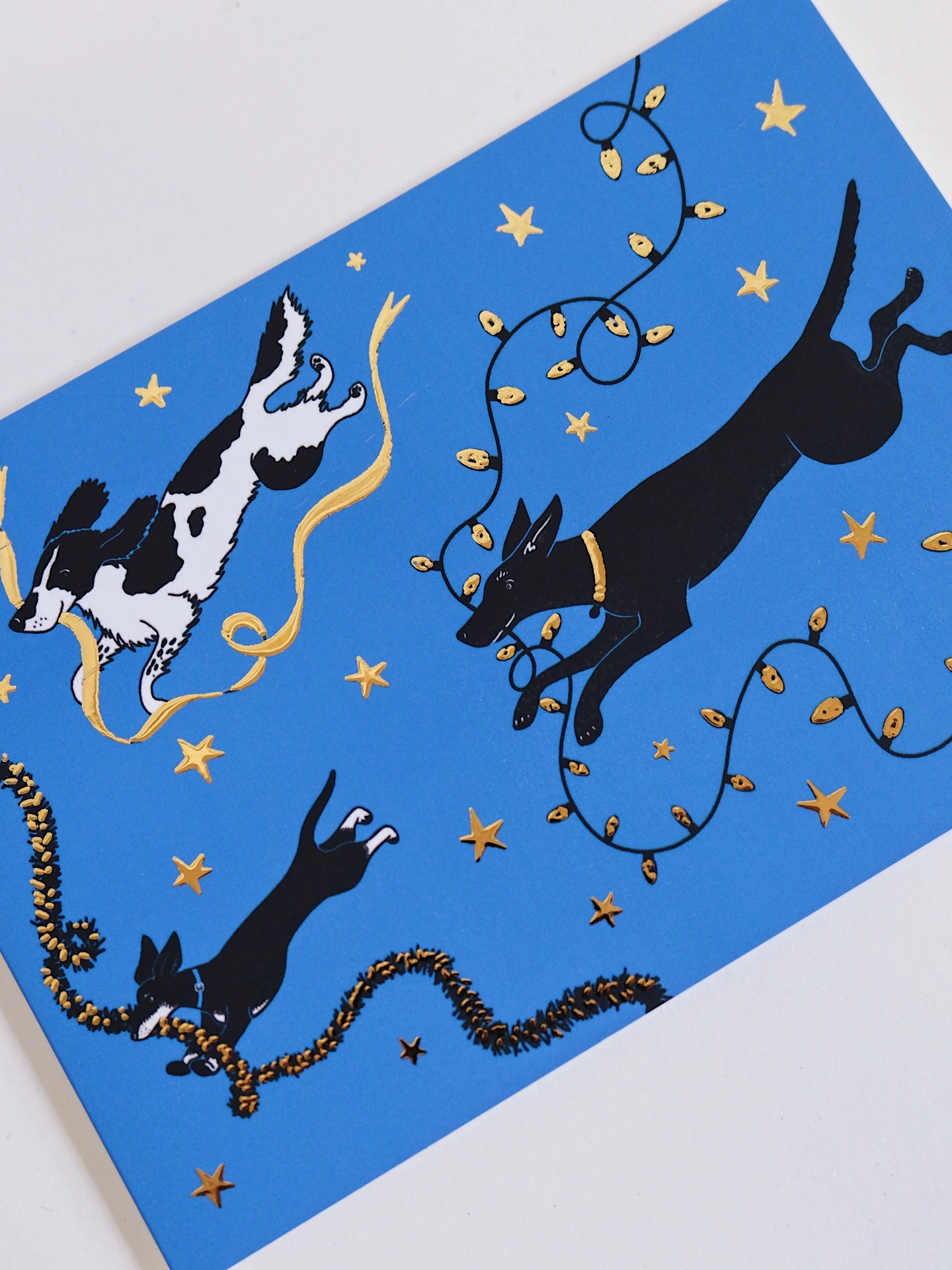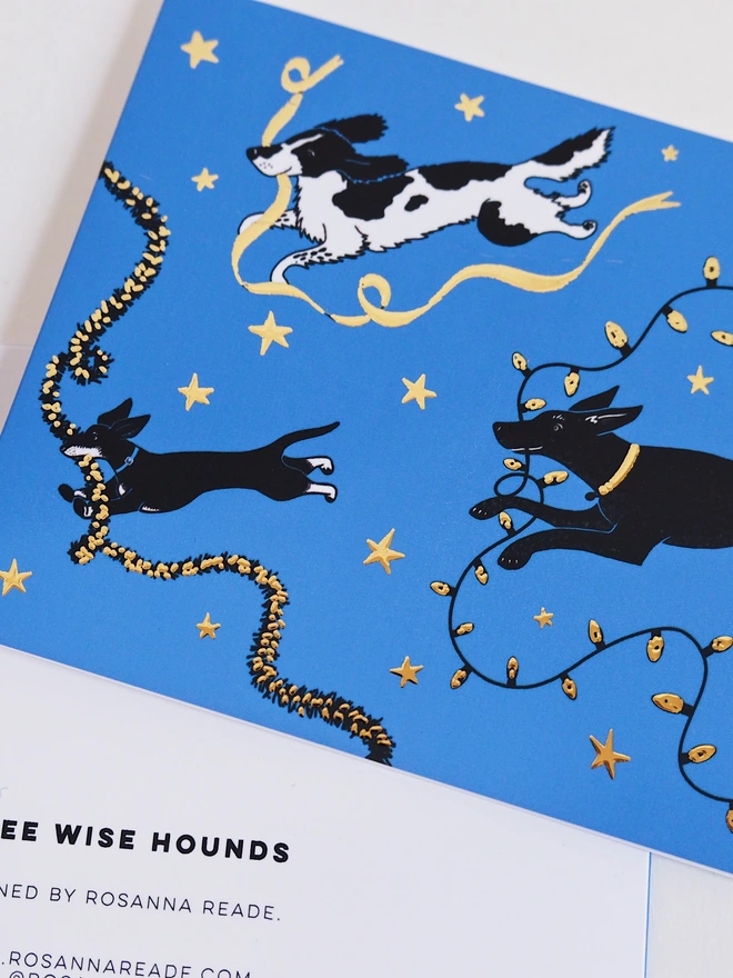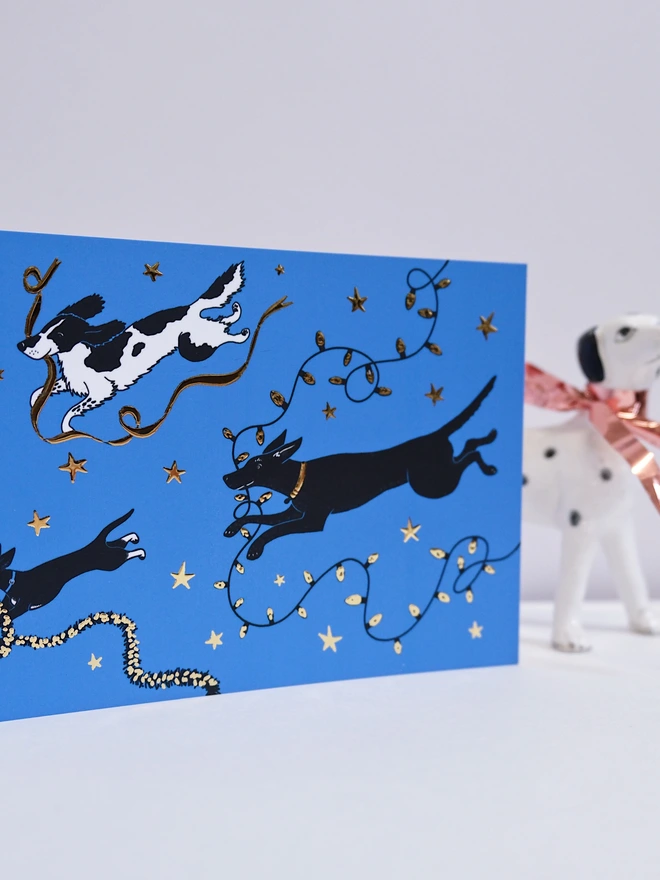 A beautiful blue card with gold foil detail, showing three dogs running away with the Christmas decorations!