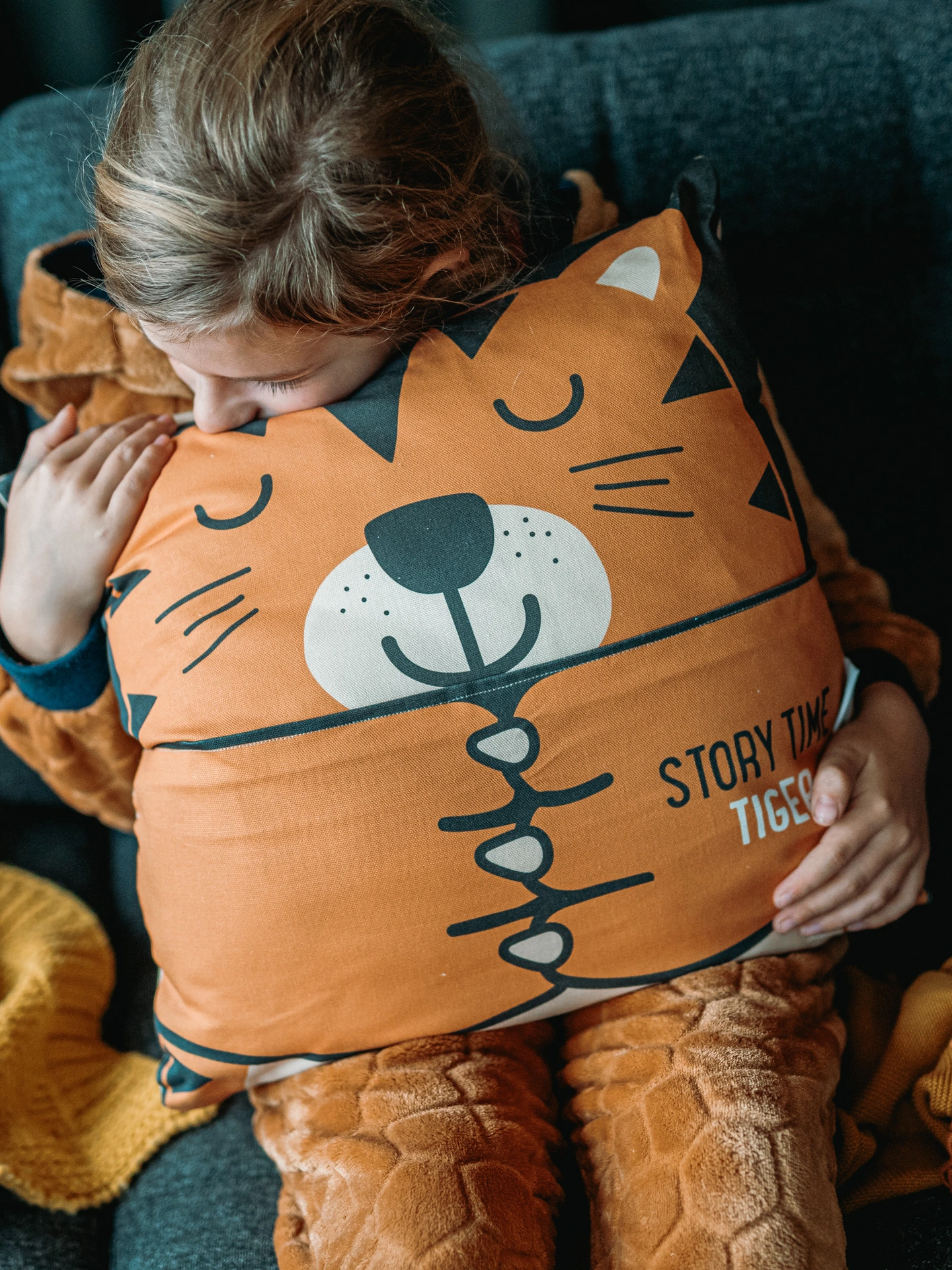 A beautifully soft, personalised Tiger Story Pocket Cushion, featuring a friendly bear who holds your child’s favourite book in the pocket. Handmade in the UK, it brings calm, comfort and imagination for every bedtime or story time
