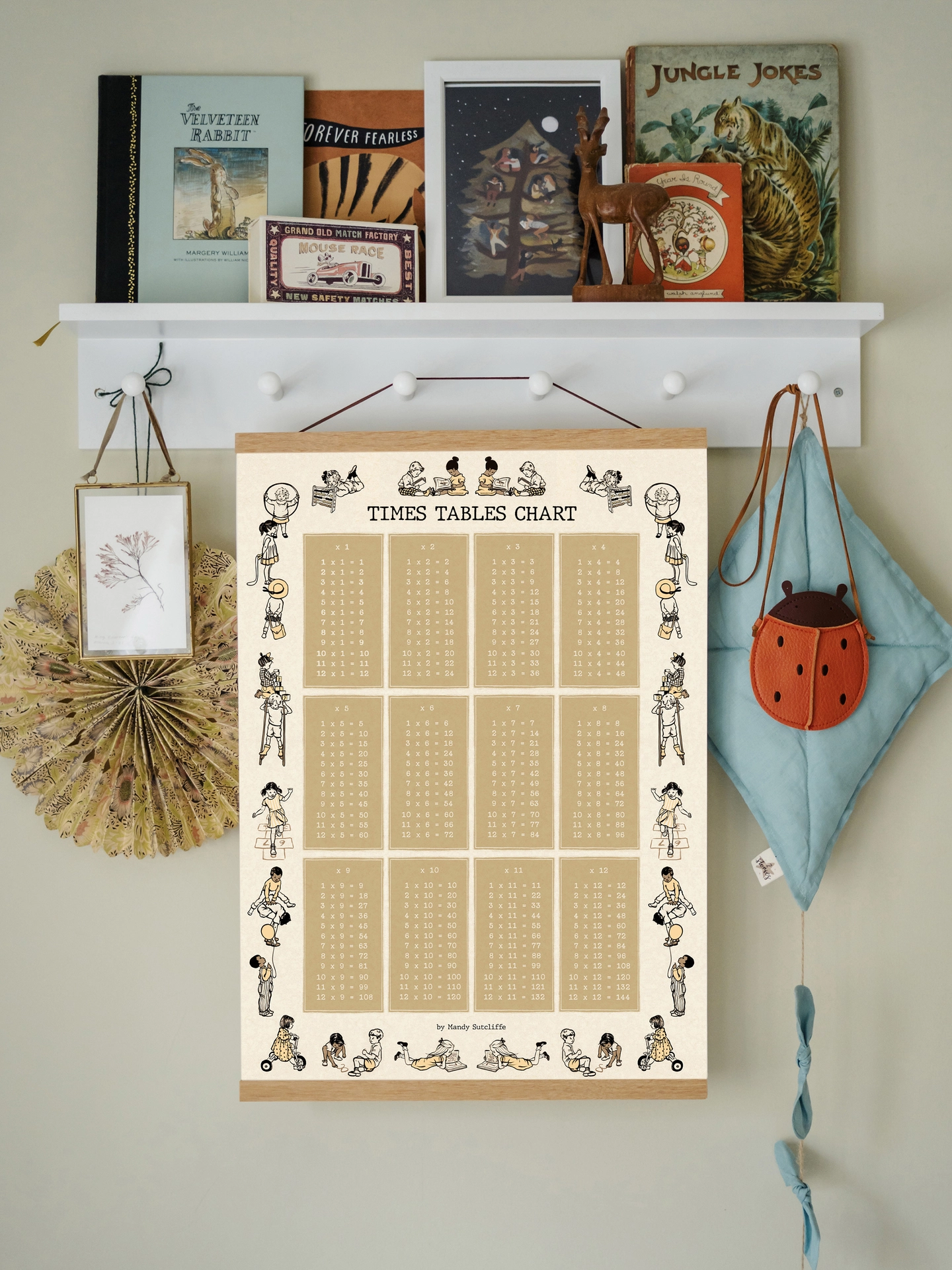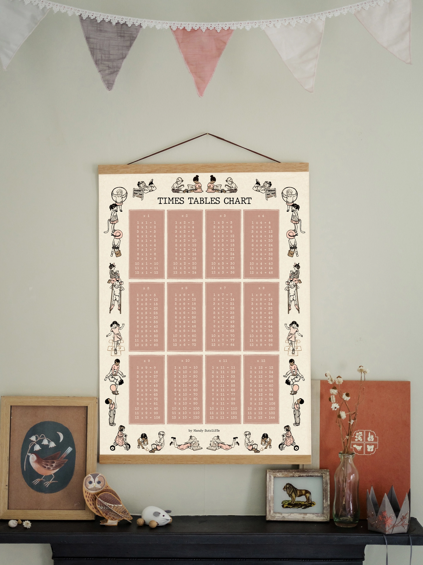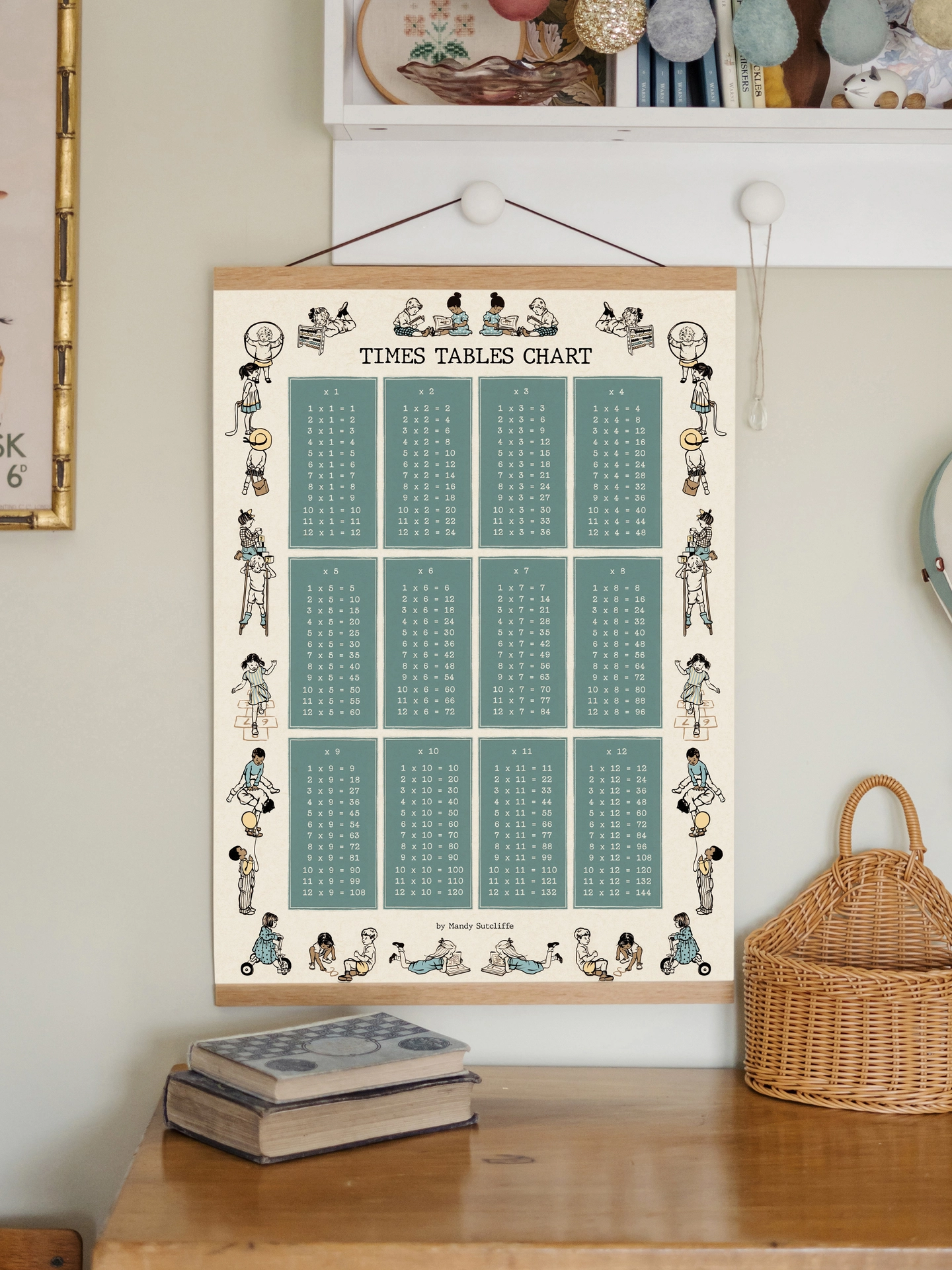 I illustrated this Times Tables Chart after searching high and low for a beautiful piece of educational art I could hang in my home, to help teach my children their times tables. Surrounding the columns of numbers 1-12 are my vintage story book style illustrations of sweet children playing, reading and counting. Available in 3 pretty colours, the perfect vintage style educational art work to adorn any playroom, bedroom or nursery (or if like me the down stairs loo!)