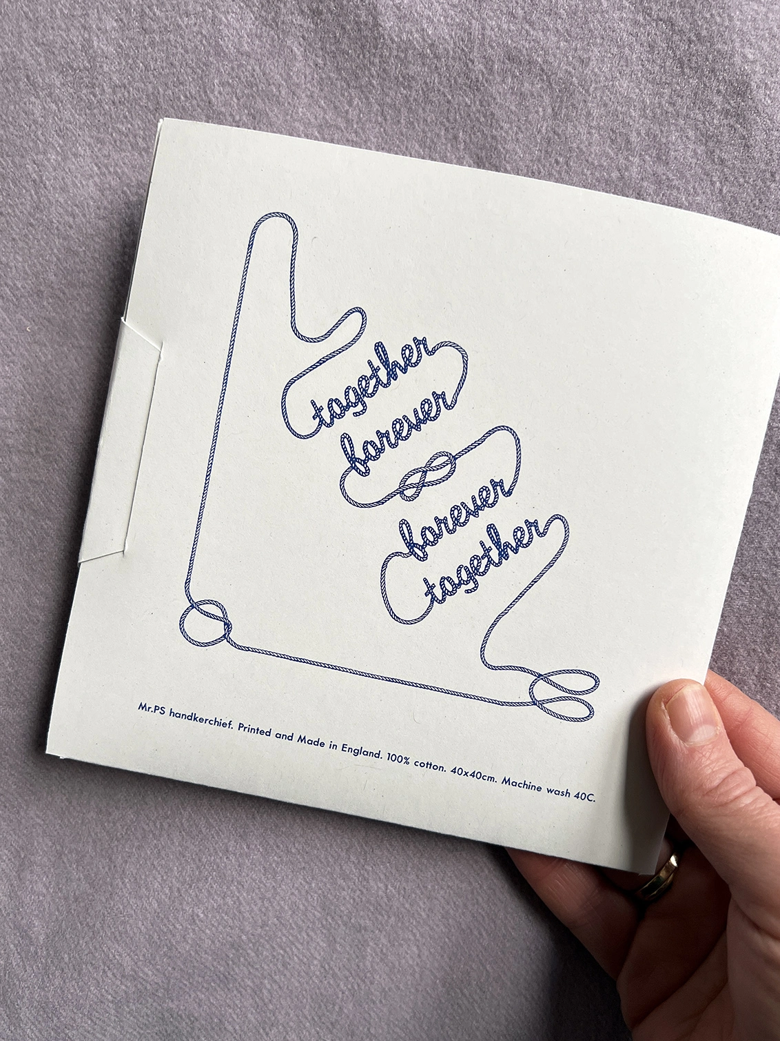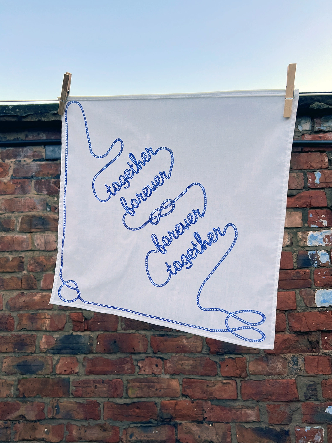 Together Forever & Forever Together, this romantic screenprinted cotton hankie is a perfect gift for those tying the knot; and as a (cotton) wedding anniversary present.