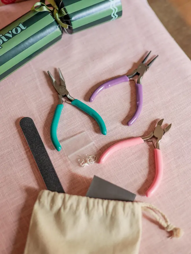 If you don’t already have your own tools, this simple kit has the essentials: pliers for opening jump rings, snippers for cutting your acetate and sandpaper/emery board to smooth or shape your acetate pieces.
