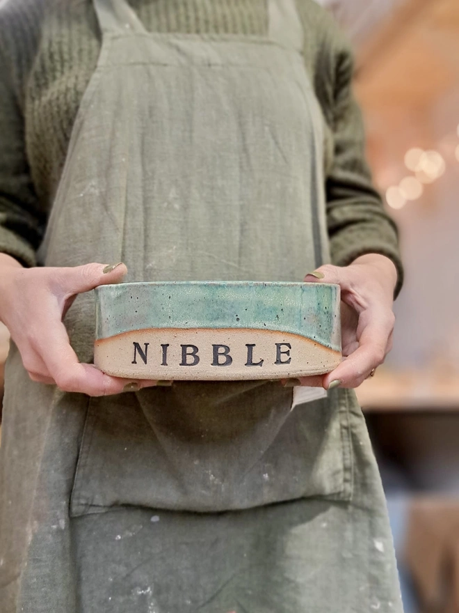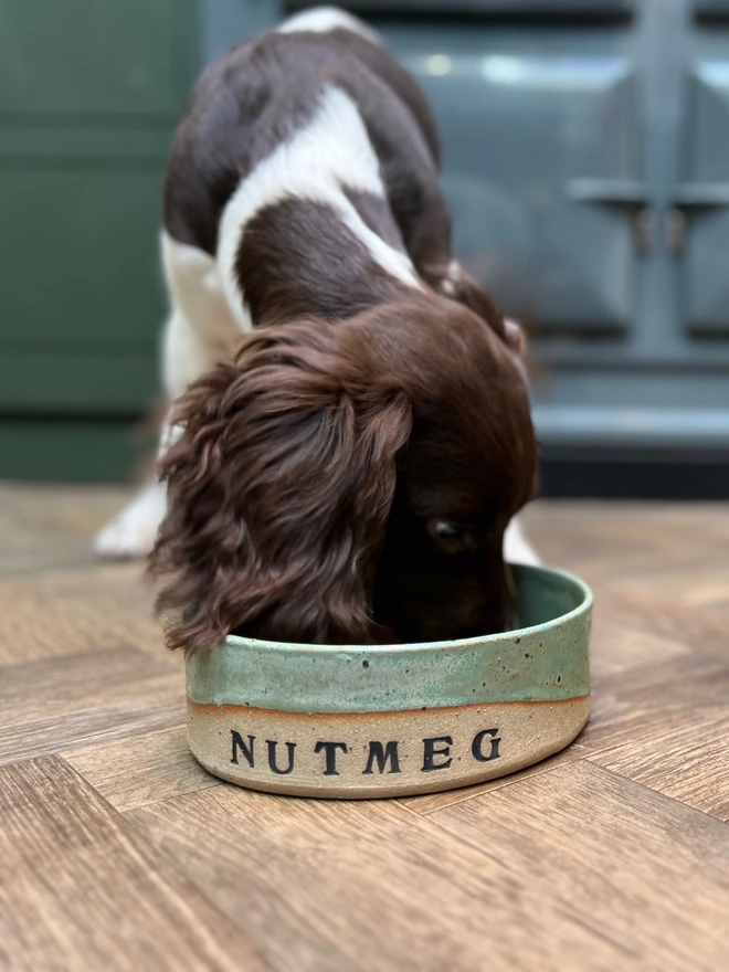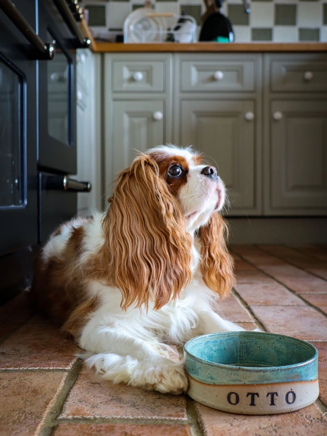 These stoneware Pet Bowls are made using the art of hand-building which requires the clay to be rolled flat using a slab roller. Pattern pieces are then cut and names are stamped into the clay. I then build into the desired shape with the help of a former. After the Bowls have dried naturally for a week, they go into the kiln for their first firing at 1000 degrees. When they have completed the 24hr program, they are ready to be glazed. I hand-paint the lettering with a dark grey underglaze then apply 2-4 coats of glaze to the main body of the Bowl. They are then fired for the second time at 1200 degrees for another 24hrs. After they’ve cooled sufficiently, I sand the base and meticulously pack them up using fully recyclable packaging.