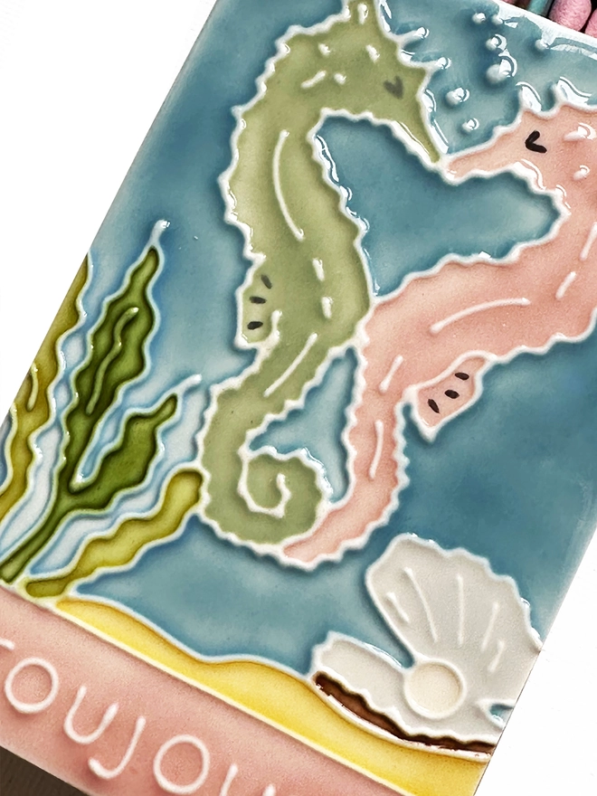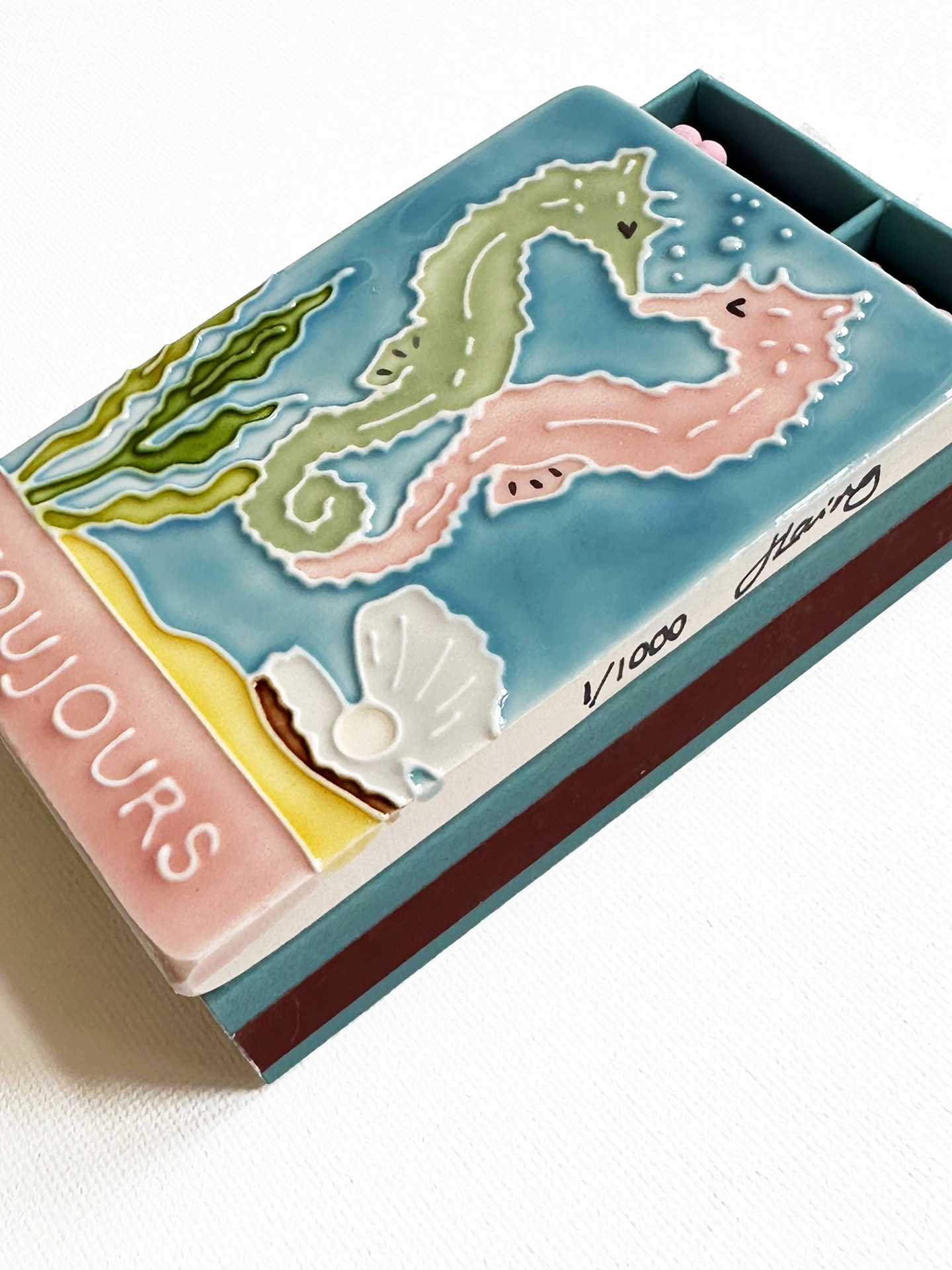 The ceramic artwork sits atop a luxury card case with striker strip. Each box contains 40 coloured extra long safety matches.
