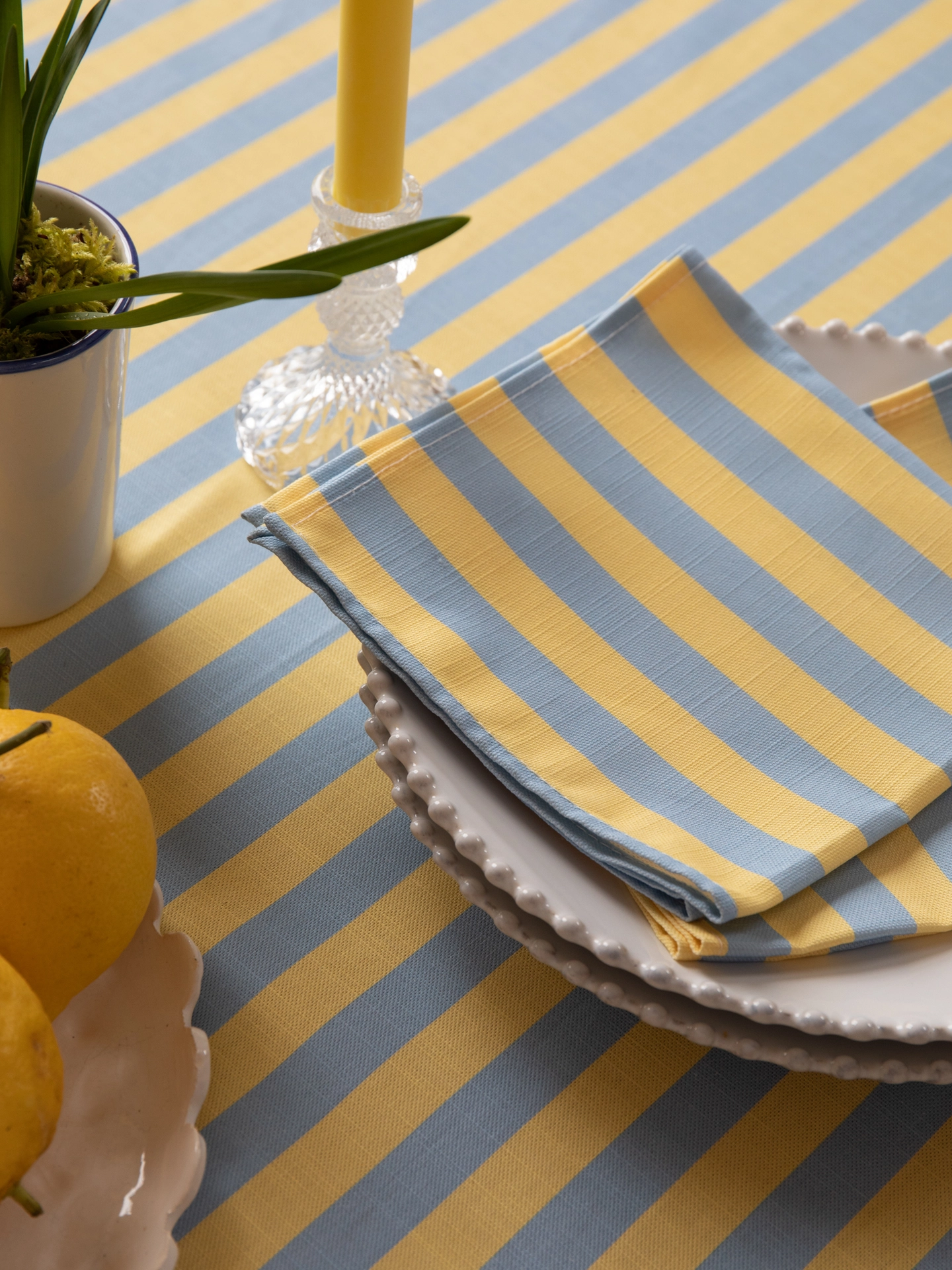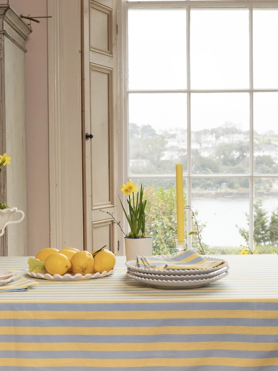 Add some nostalgic charm your dining setting with our gorgeous napkins in our 'Trianon The print features playful stripes in zesty yellow and sky blue